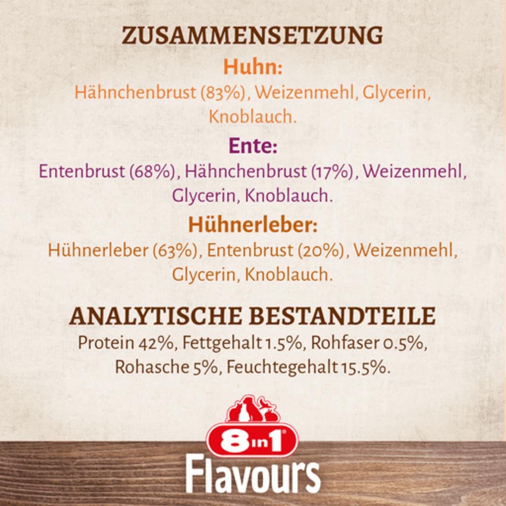 68 % eendenborst, 17 % kipfilet, tarwebloem, glycerine, knoflook