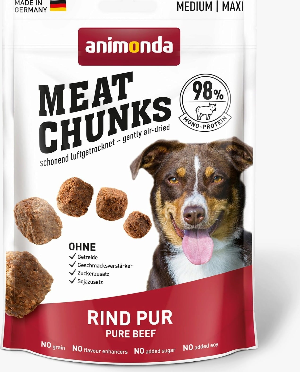 Zo nu en dan, tussen de maaltijden door, kun je je goed opgevoede viervoeter verwennen met een heerlijke traktatie! De Meat Chunks zijn niet alleen lekker, ze verwennen je hond ook met een enkele bron van eiwitten, zonder toevoeging van soja, suiker, granen of smaakversterkers!