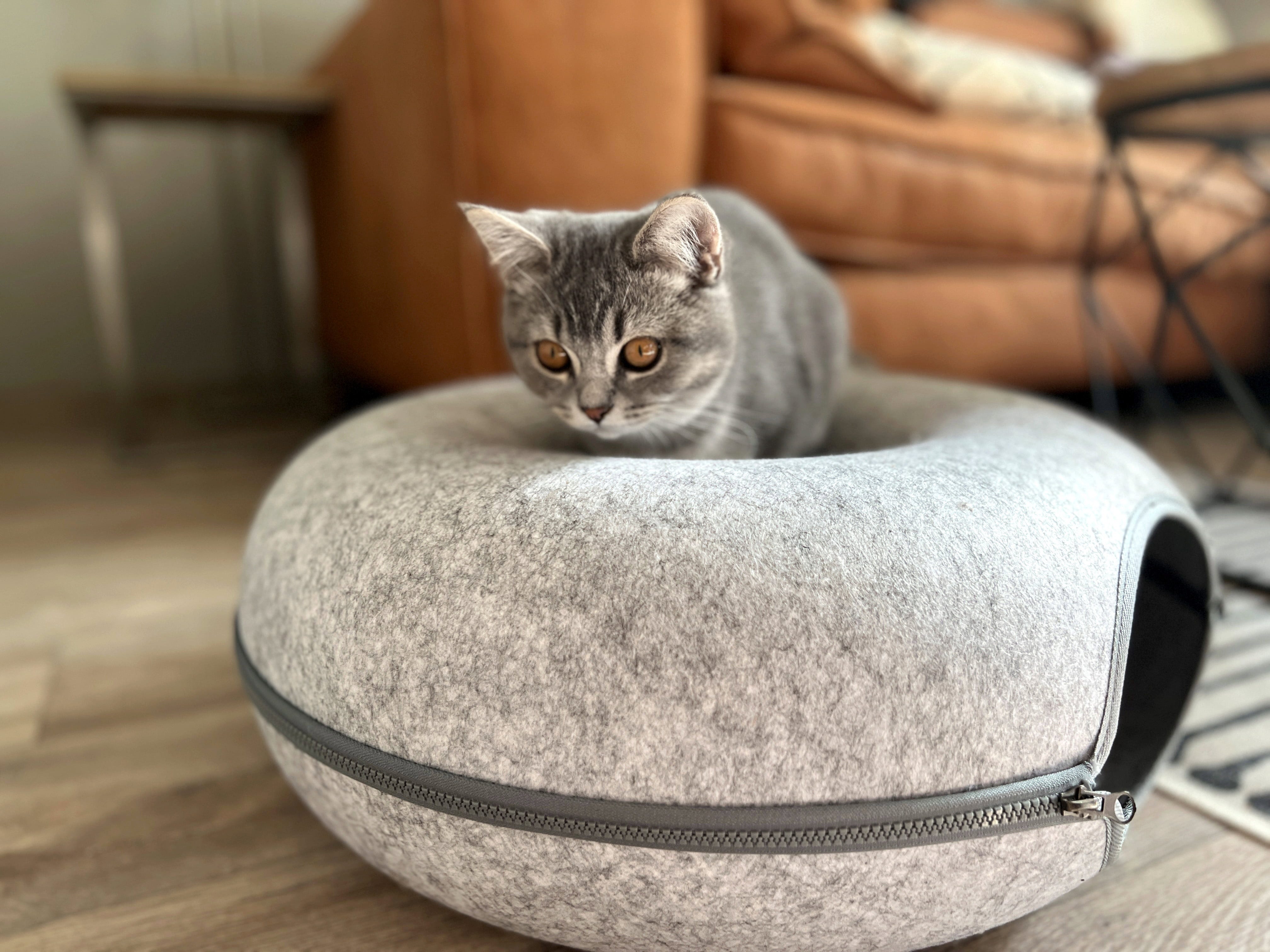 Deze kattentunnel van stevig wolvilt is een gezellige schuilplek waar je kat heerlijk kan uitrusten na al haar avonturen. Maar dat is nog niet alles: dankzij de rondomlopende rits kan de tunnel volledig worden geopend en omgevormd tot een stijlvolle kattenmand. Lekker knus dicht of juist open – jouw kat kiest zelf.