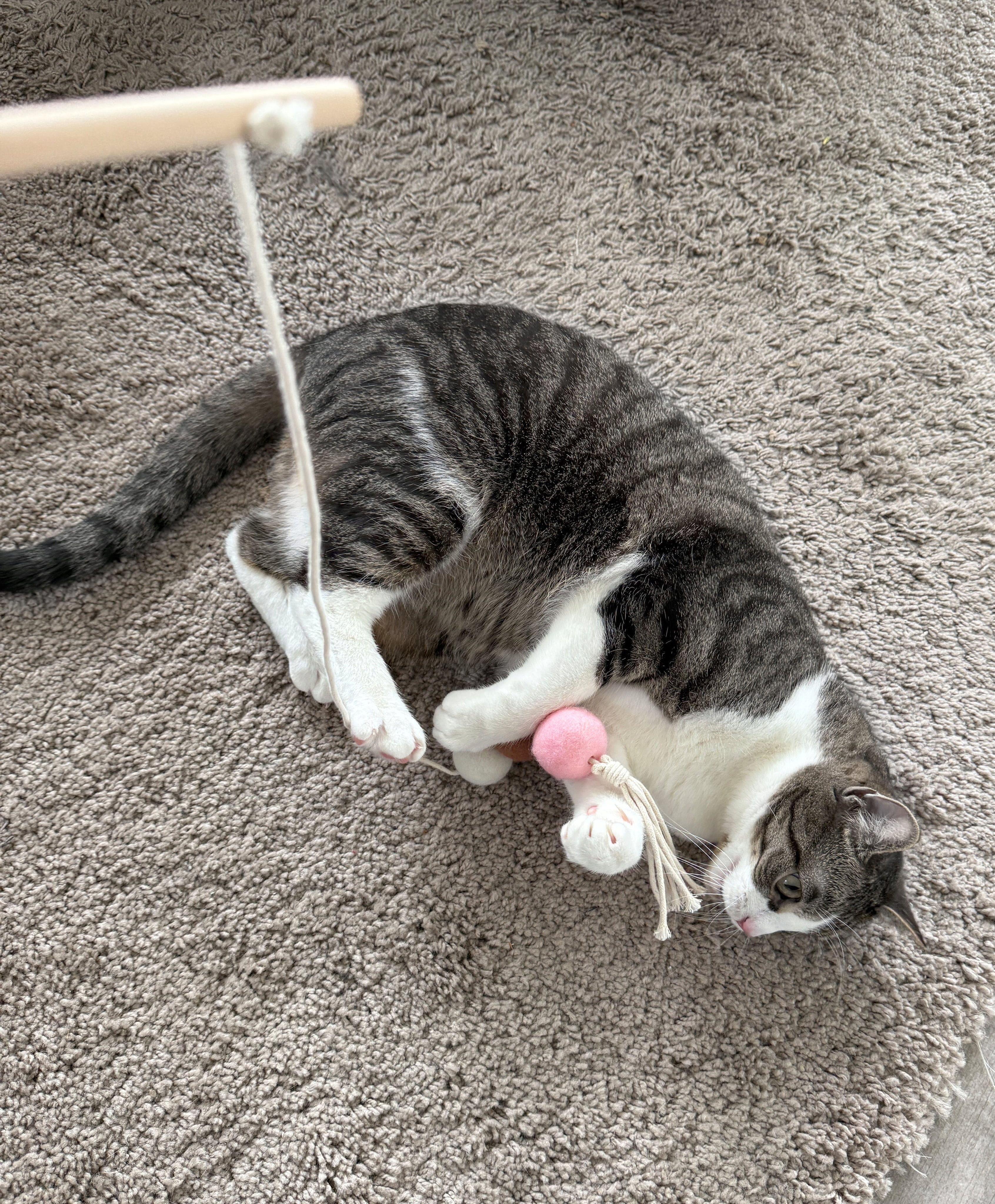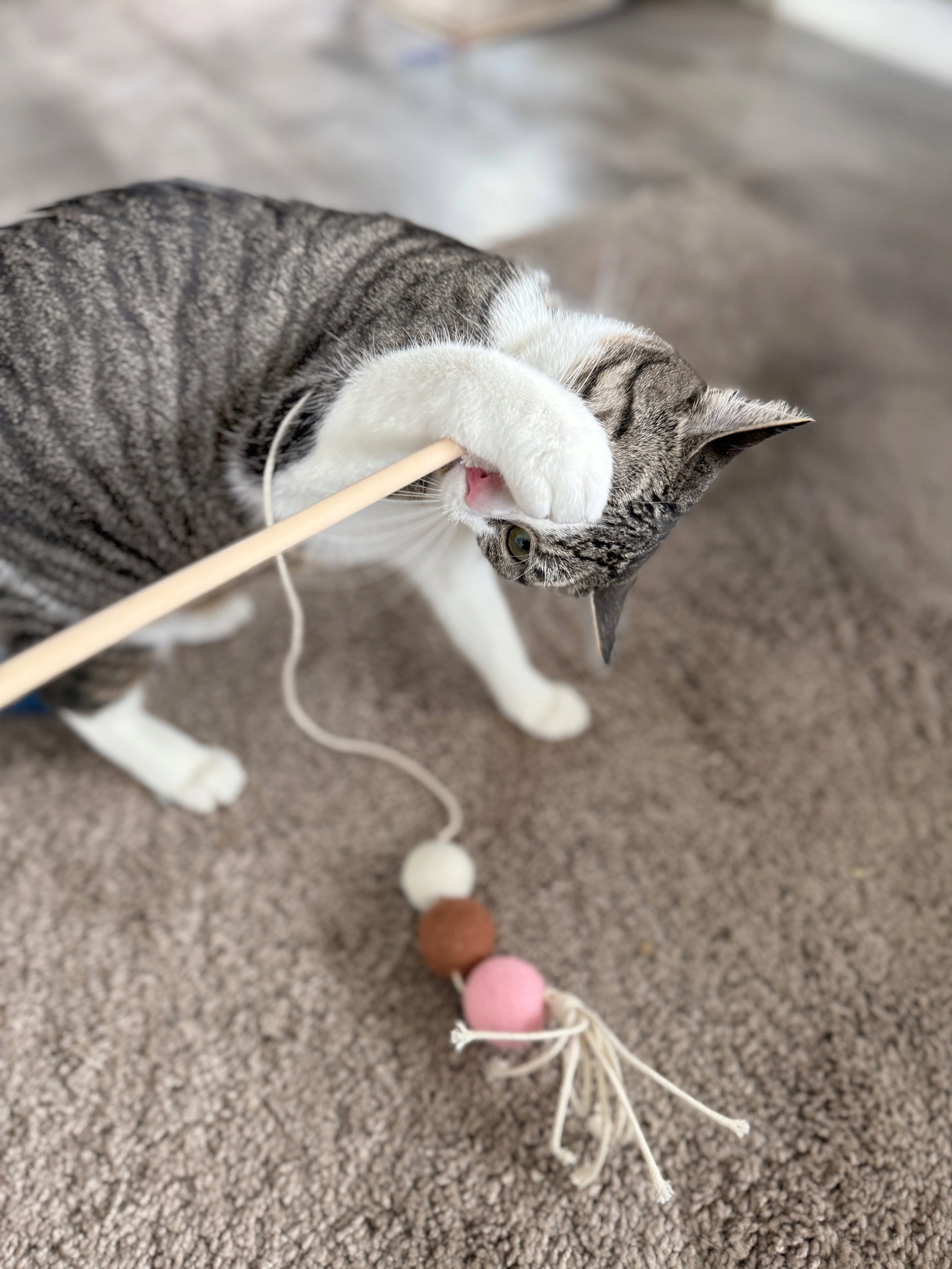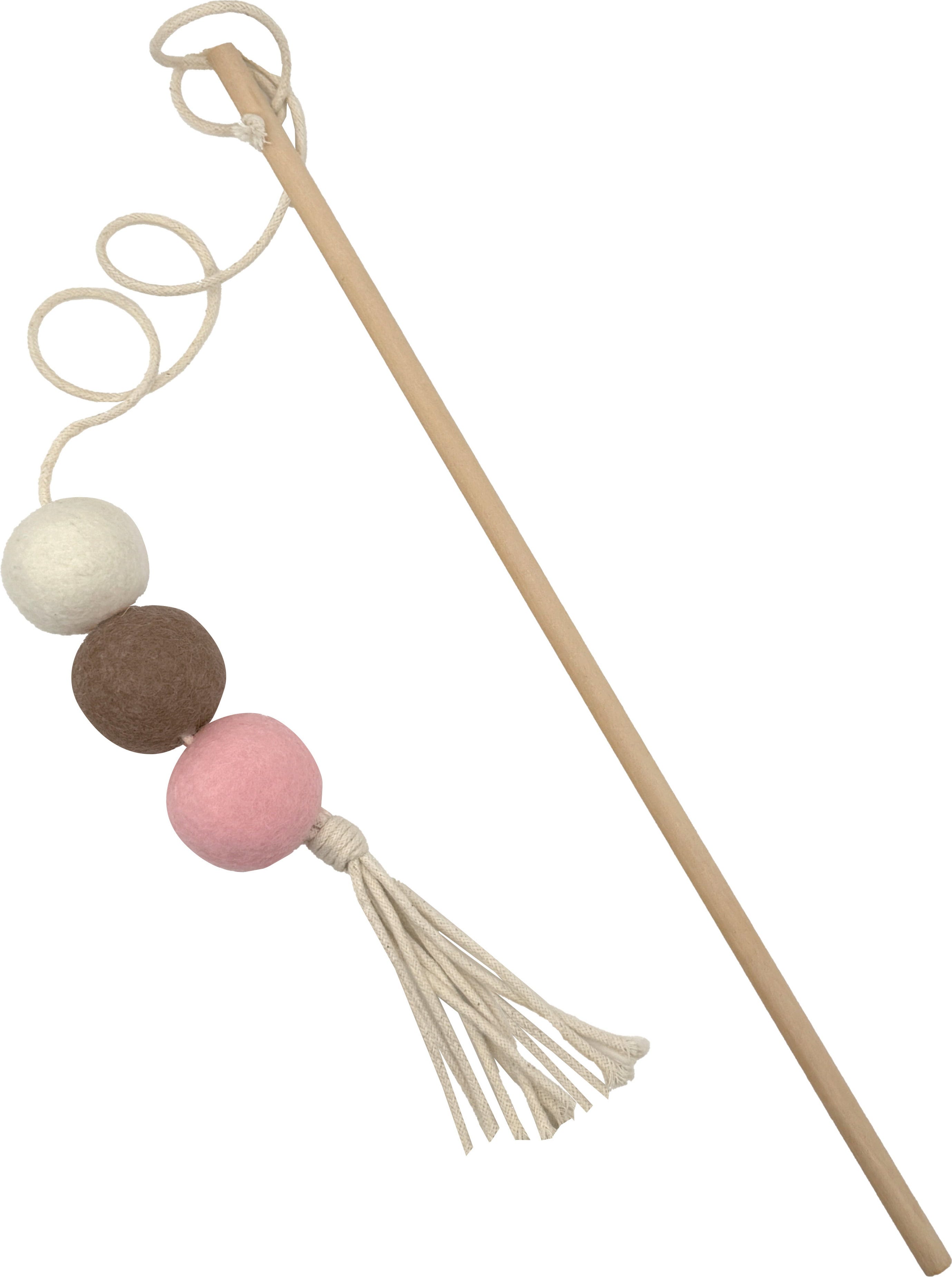 Je kat zal ongetwijfeld dol zijn op dit fantastische speeltje! Het stevige ontwerp met een houten stokje, 3 vilten balletjes en macramé-achtige knopen maakt het niet alleen een lust voor het oog, maar zorgt ook voor uren speelplezier.