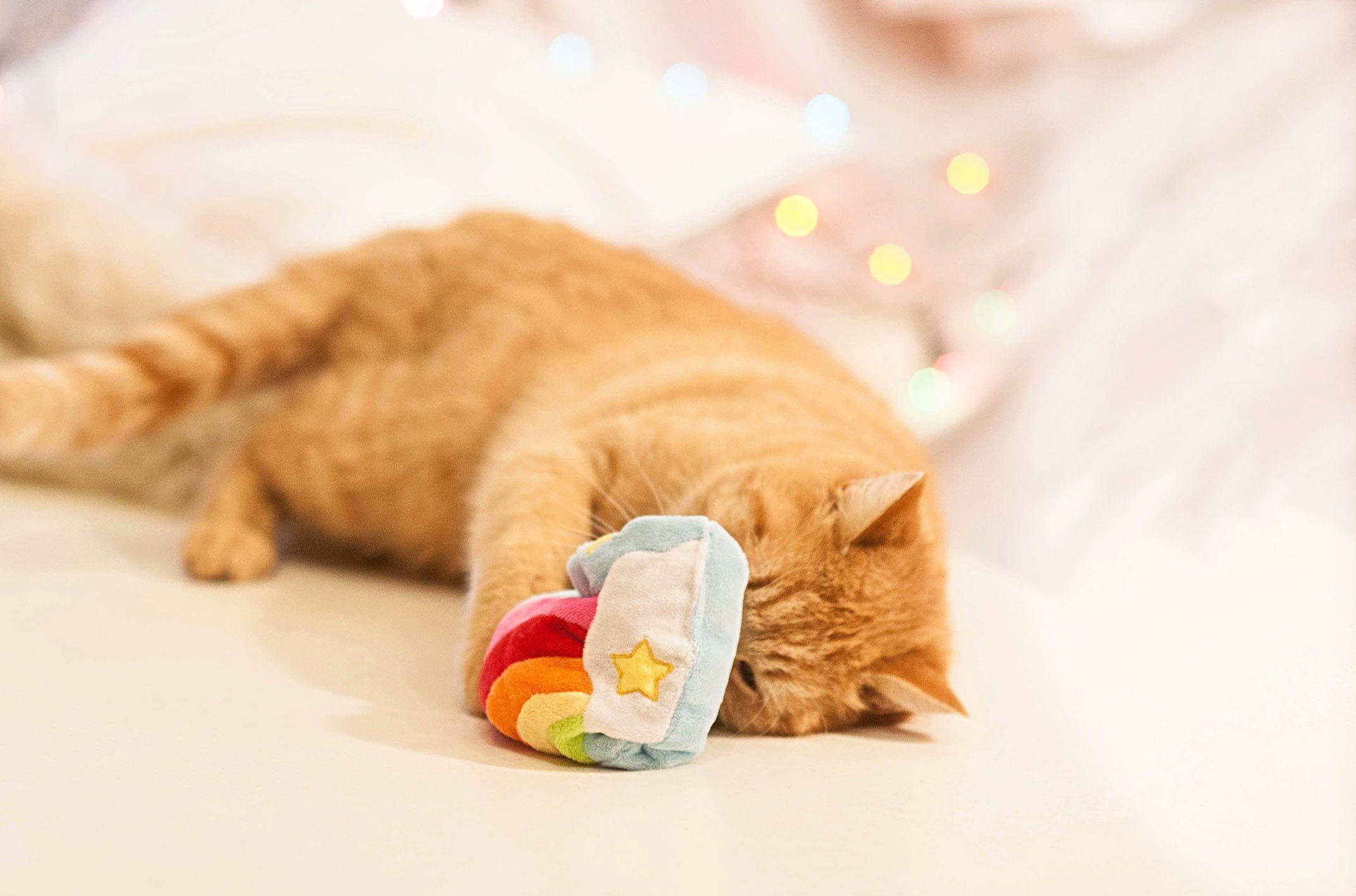 Somewhere over the rainbow... Deze regenboog maakt niet alleen indruk met zijn schattige ontwerp, maar ook met zijn innerlijke waarden: een vulling van speltkaf en valeriaanwortel maakt hem gewoonweg onweerstaanbaar voor speelse huiskatten.