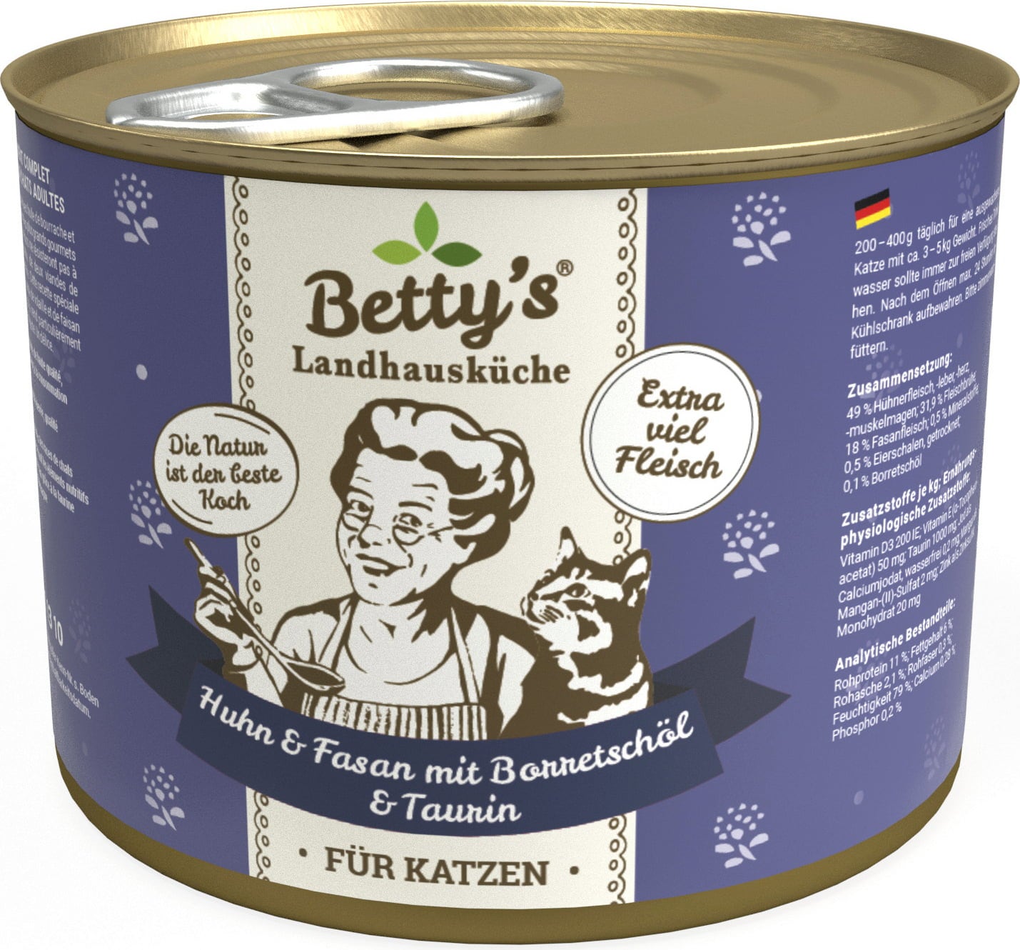 Betty's Landhausküche kip & fazant met borageolie smaakt zelfs de meest veeleisende huiskat! Grondstoffen van de hoogste kwaliteit en een vleesgehalte van 67% zorgen voor een authentieke smaak. Een culinaire droom voor alle viervoetige fijnproevers.