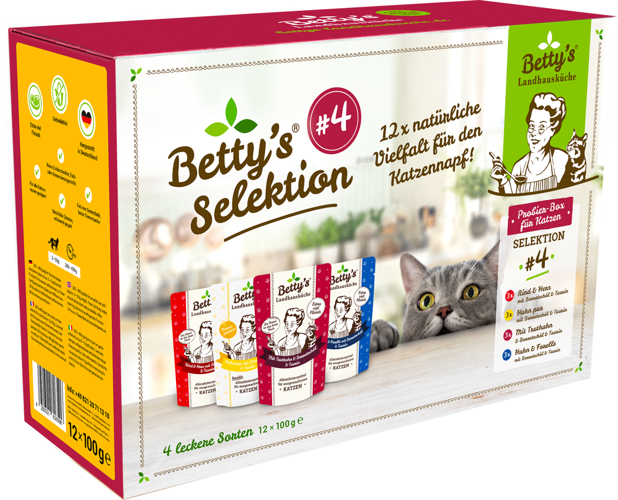 Deze doos bevat 4 heerlijke smaken uit de populaire maaltijdzakjes van Betty's Landhausküche. Zo kun je je kat elke dag een heerlijke afwisseling bieden en hem verwennen met geselecteerde ingrediënten in op de soort afgestemde recepten - zelfs kieskeurige fluwelen pootjes zullen het niet kunnen weerstaan.