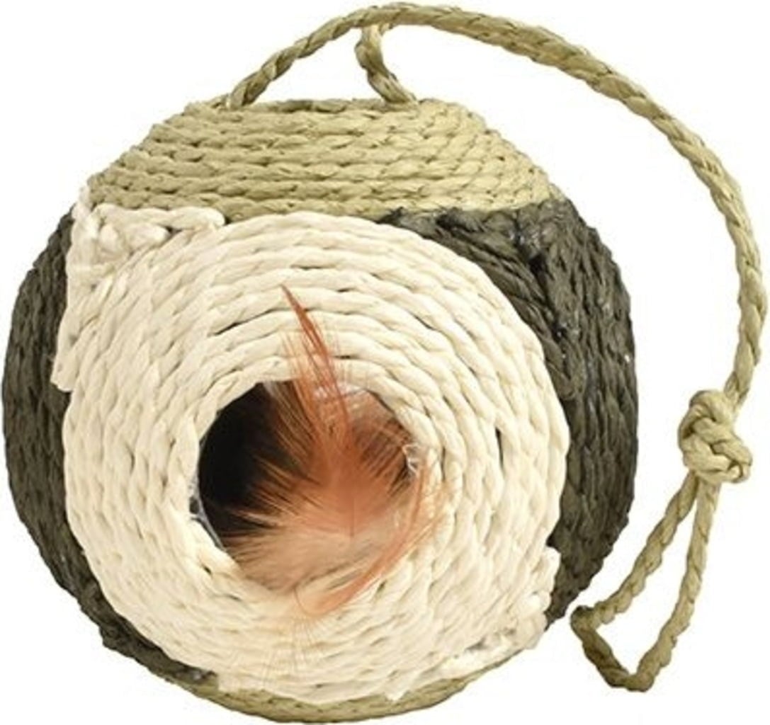 Deze hangende bal dient als krabstation en speeltje: hij is omwikkeld met extreem stevig touw gemaakt van gerecycled papier. Hij plaagt je kat ook met een klein plukje stekels in de holle binnenkant van de bal - zo wordt ook het natuurlijke jachtinstinct gestimuleerd.