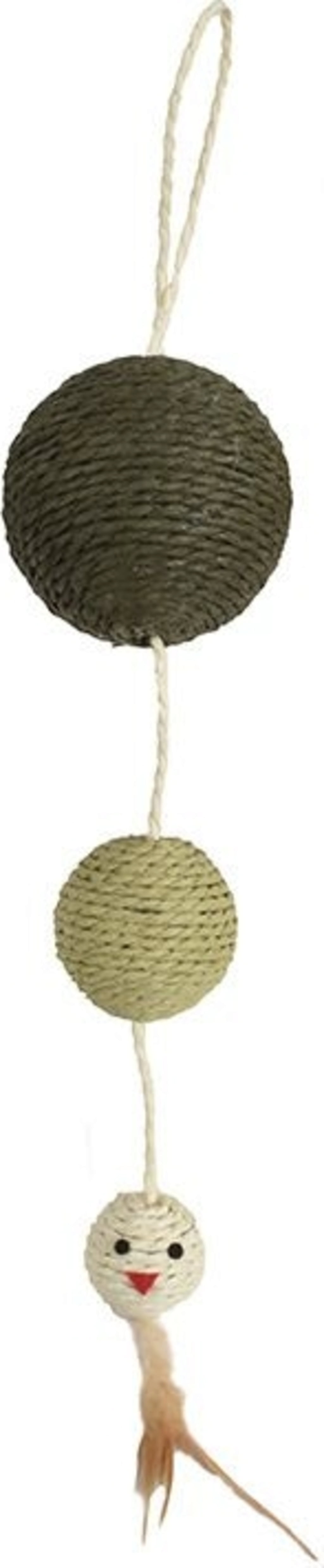Dit speeltje is ook een hangend krabstation. Dankzij de handige afmeting kun je het bungelende geheel overal neerzetten. Het is gemaakt van gerecycled papiertouw, dat extreem robuust is en bestand tegen elke krabaanval, en echte stekels. Katten moeten de kans krijgen om hun natuurlijke instinct om te jagen en te spelen te vervullen: De mobielachtige structuur vermaakt je dierlijke huisgenoot zelfs als hij alleen thuis is.