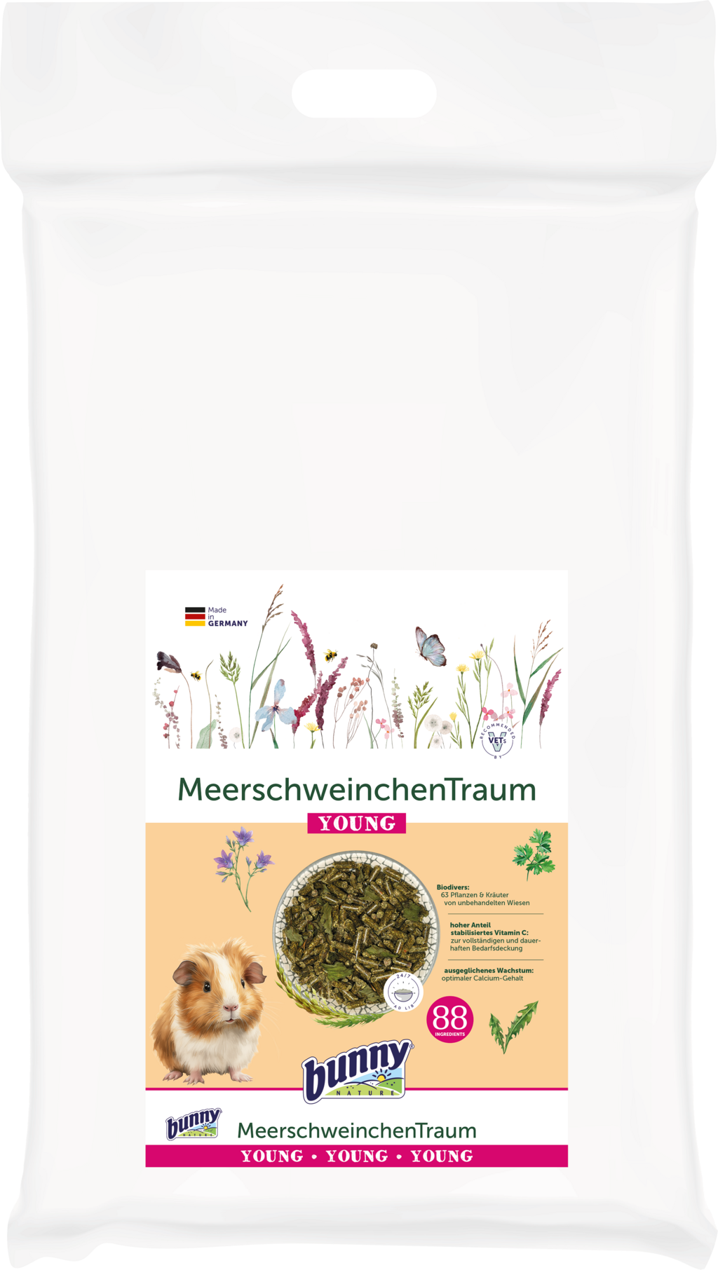 Als cavia's dromen uitkomen... is dit heerlijke voer zeker niet ver weg! Met 63 verschillende planten van onbehandelde weiden, gestabiliseerde vitamine C en ingrediënten zoals quinoa, amarant, aroniabessen en maca, zorgt het vanaf het begin voor smakelijke afwisseling in de voerbak en maakt het een hoogwaardige, soorteigen voer voor je jonge cavia's mogelijk.