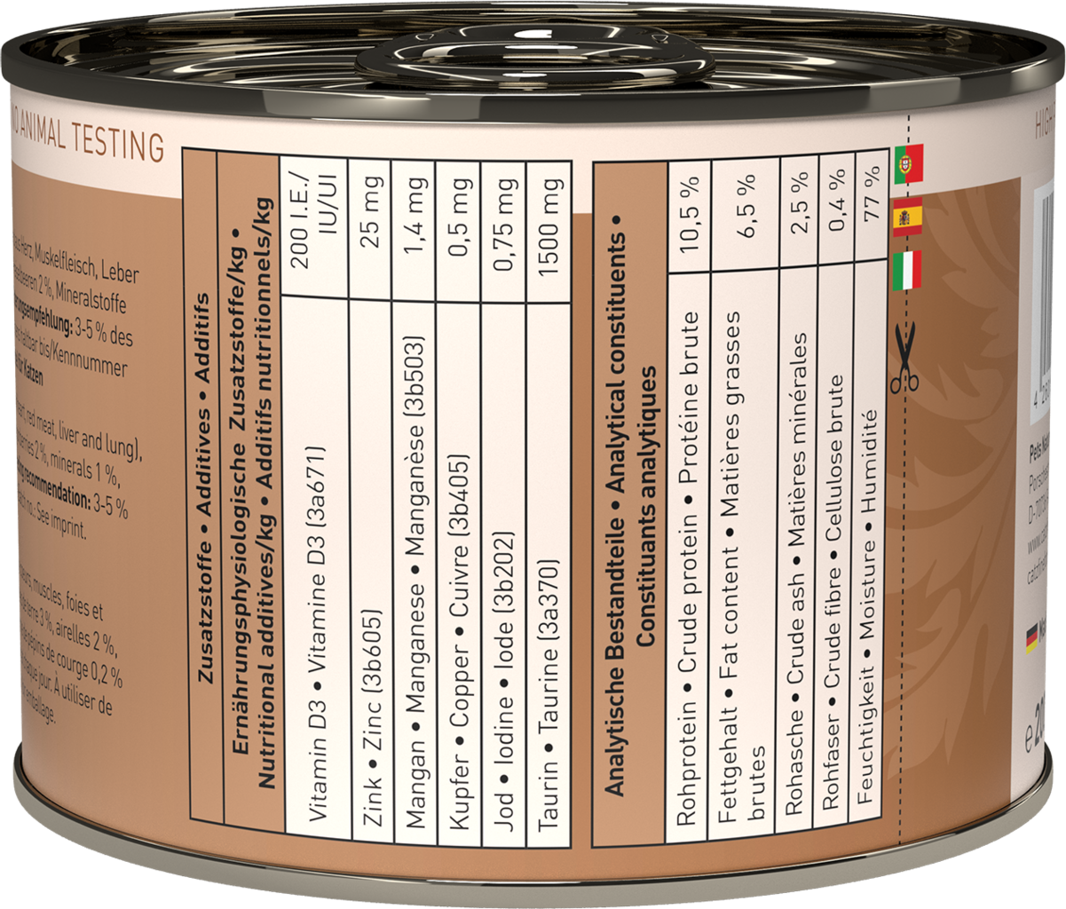 Met dit premium natvoer kun je je kat verwennen met iets heel speciaals en hem verwennen met geselecteerde natuurlijke ingrediënten van uitstekende kwaliteit en voortreffelijke smaak. Dit voer is samengesteld volgens het prooidierconcept, respecteert de natuur van je kat en herstelt zo zijn oorspronkelijke levenskwaliteit.