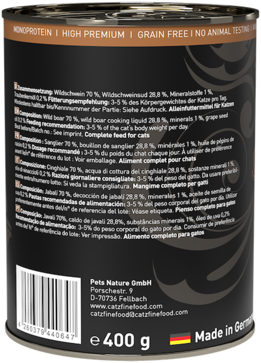 70 % wildzwijn, 28,8 % bouillon van wild zwijn, 1 % mineralen, 0,2 % druivenpitolie