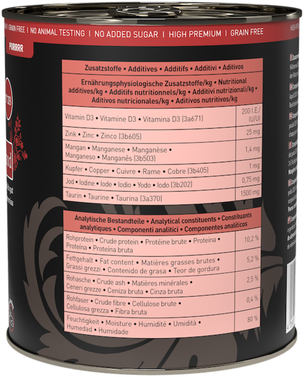 Dit heerlijke premium natvoer laat je kat gegarandeerd spinnen! Geselecteerde ingrediënten, een soortspecifieke receptuur gebaseerd op het prooidierconcept en geen overbodige poespas - puur genot voor je huistijger en een uitstekende basis voor een vitaal kattenleven.
