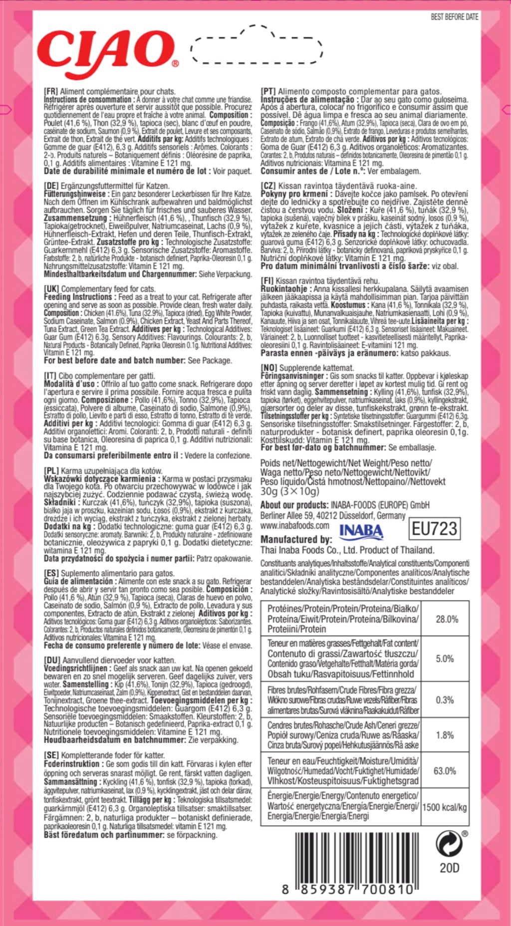 41,6 % Kippenvlees, 32,9 % tonijn, gedroogde tapioca, eiwitpoeder, natriumcaseïnaat, 0,9 % zalm, kippenvleesextract, Gist, tonijnextract, groene thee-extract