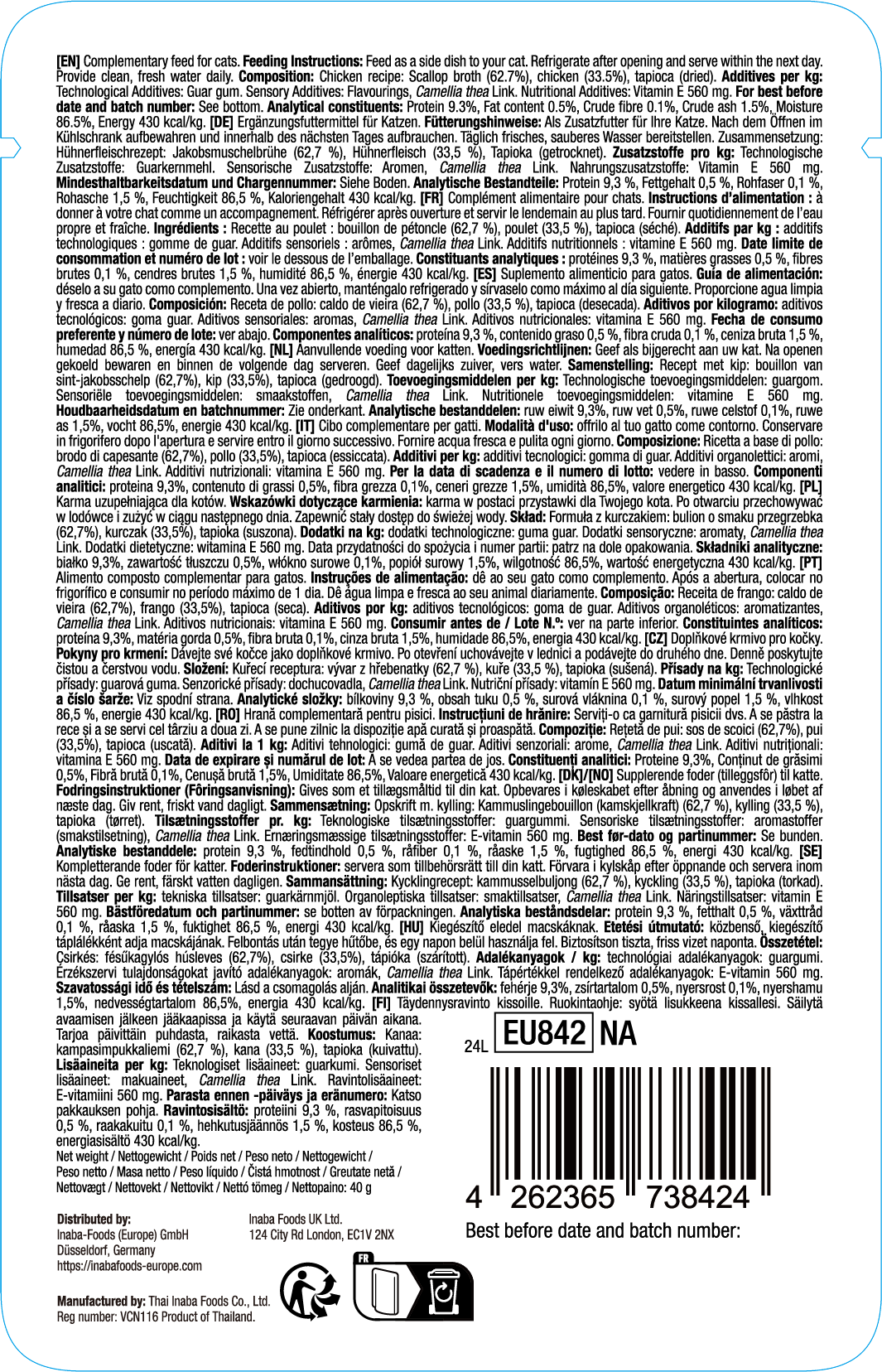 62,5 % bouillon van sint-jakobsschelpen, 33,5 % Kippenvlees, gedroogde tapioca, guargom, agar
