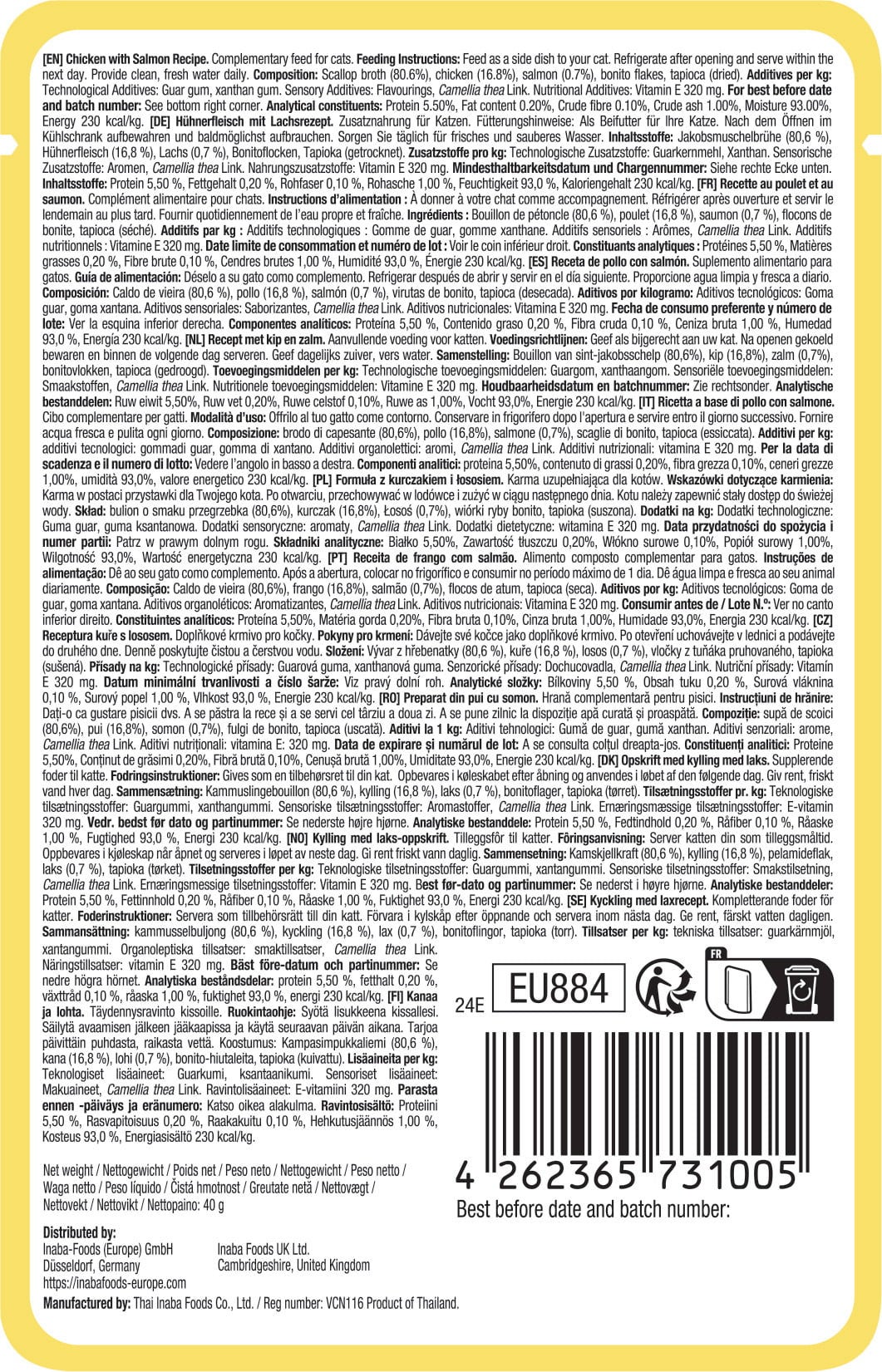 80,6 % bouillon van sint-jakobsschelpen, 16,8 % Kippenvlees, 0,7 % zalm, bonito-vlokken, gedroogde tapioca, guargom, xanthaangom, aroma's