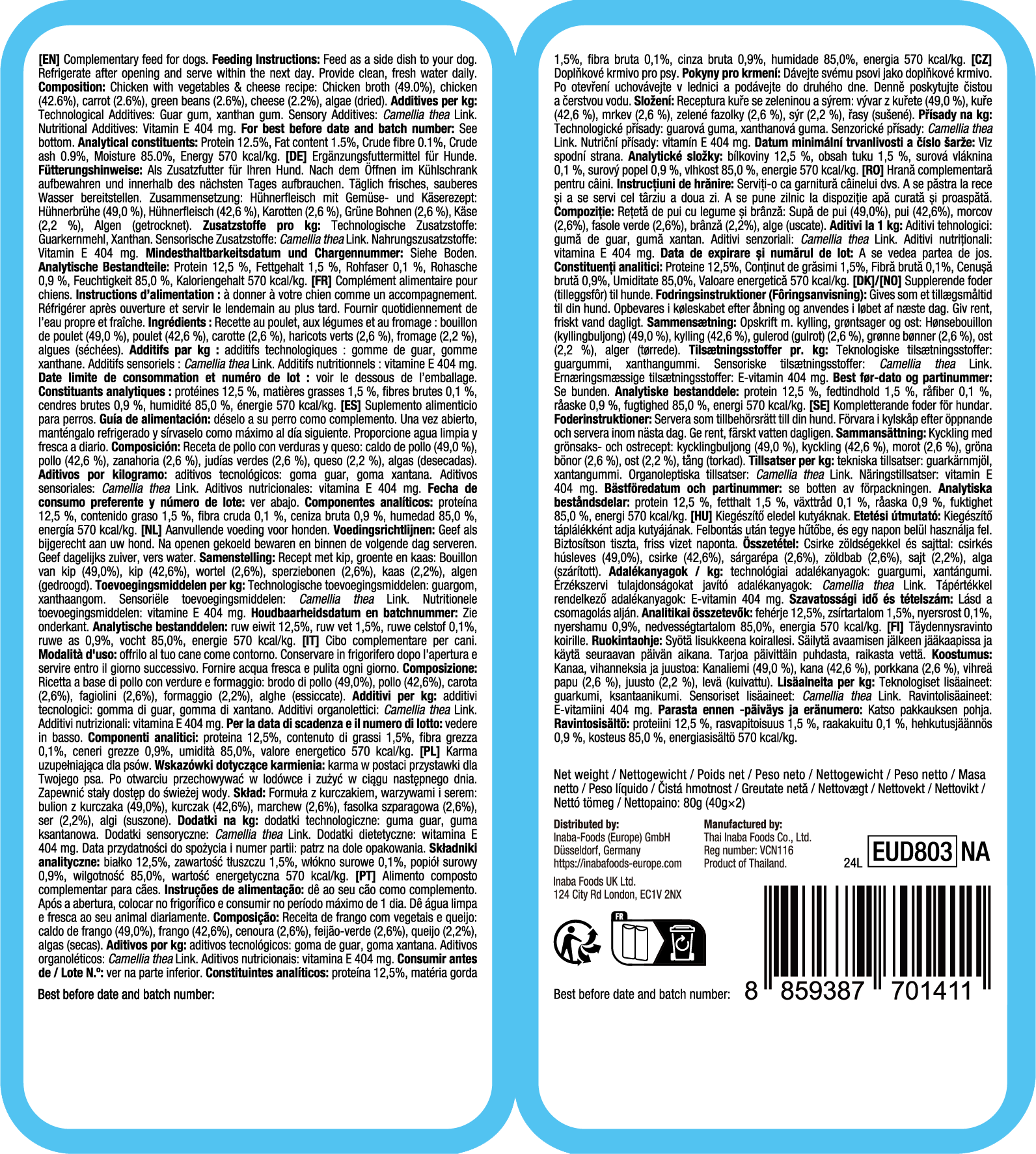 bouillon van kip, 42,6 % Kippenvlees, 2,6 % wortelvlokken, 2,6 % sperziebonen, 2,2 % kaas, gedroogde algen, guargom, xanthaangom