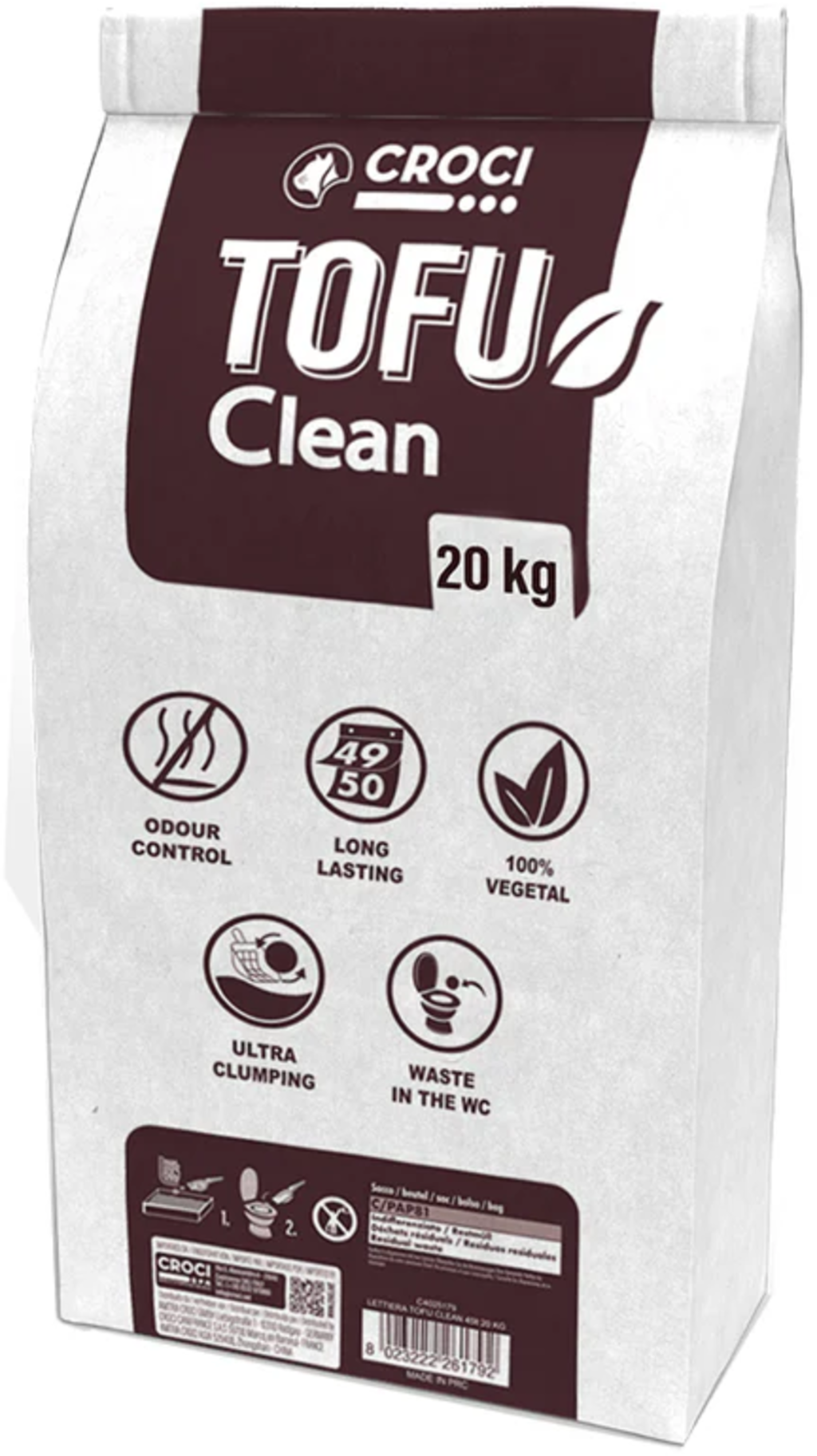 TOFU CLEAN van Croci is een puur plantaardige kattenbakvulling op sojabasis. De kattenbakvulling is biologisch afbreekbaar, bevat geen chemische ingrediënten en is zacht voor de poten van de kat. Maximale absorptie en geurcontrole!