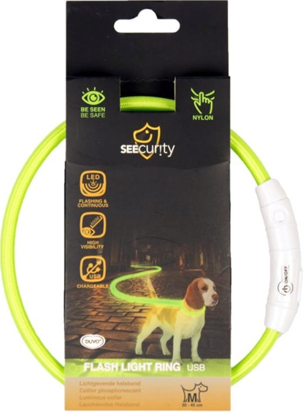 Voor duvoplus is de zichtbaarheid en veiligheid van je hond van het grootste belang! Daarom is de Flash lichthalsband van nylon uitgerust met zeer zichtbare en knipperende LED-lampjes. Zodra de lichtomstandigheden verslechteren, hoef je alleen maar op de aan/uit-knop te drukken en voilà - zichtbaarheid tot 500 meter is gegarandeerd!