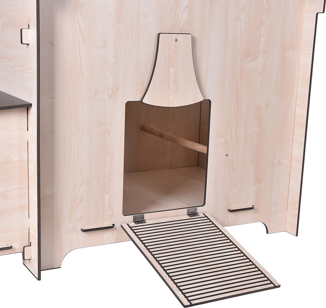 Dankzij de ruime deuropening (28 x 24 cm) is de toegang voor de dieren moeiteloos. De deur kan gesloten worden of gebruikt worden als loopplank.