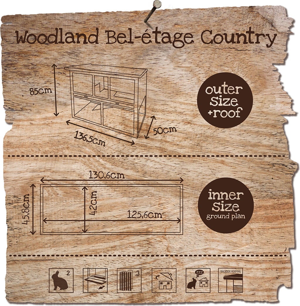Het Woodland Bel-étage Country konijnenhok biedt plaats aan 2 konijnen of knaagdieren. Het hok biedt een veilige slaapplaats op het bovenste niveau en ruimte om te spelen, eten en rondlopen op het onderste niveau. Dankzij de uitschuifbare bak is het hok gemakkelijk te ontdoen van etensresten.