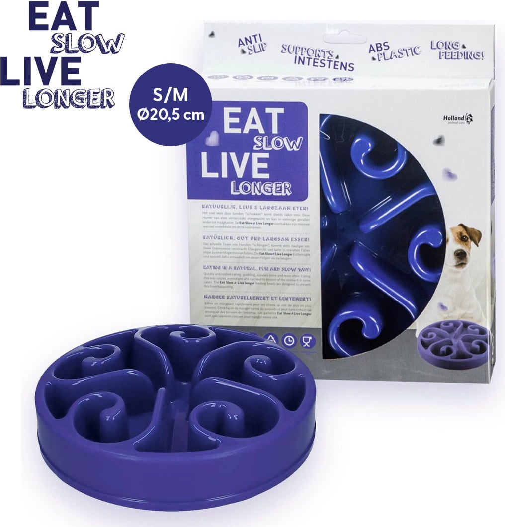 - Met speciaal spiraalpatroon dat snel eten en schrokken voorkomt