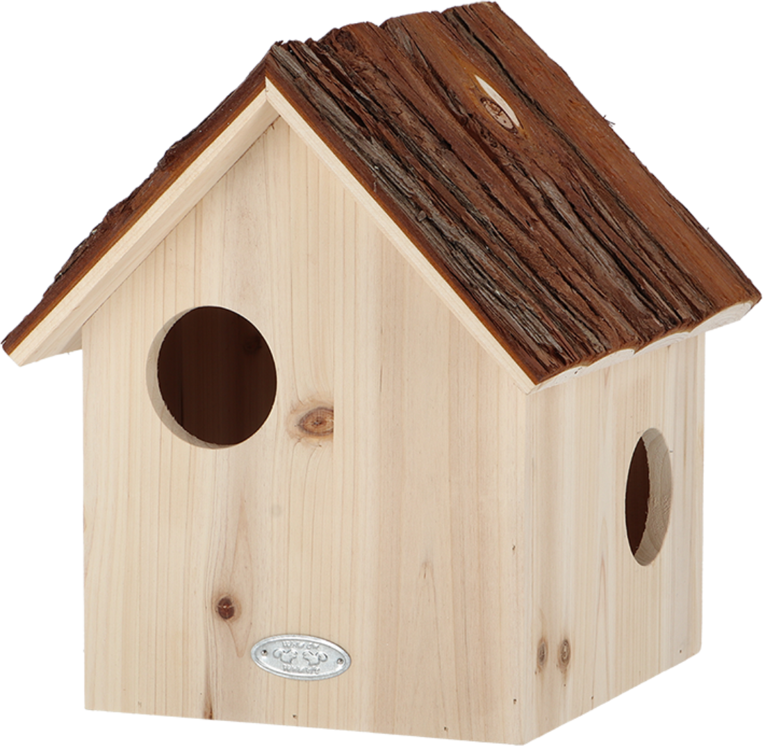 Het huis is gemaakt van FSC®-gecertificeerd dennenhout en heeft een decoratief schorsdak. Het ontwerp is speciaal afgestemd op de behoeften van eekhoorns, met veel ruimte en twee ingangen.