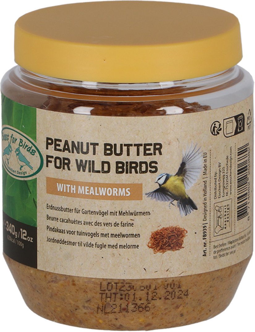 Deze rijke pindakaas bevat veel smakelijke pinda's en heerlijke meelwormen! Dit maakt het een bijzonder smakelijke en calorierijke traktatie voor de vele verschillende vogelsoorten in je tuin. Deze pindakaas bevat helemaal geen toegevoegd zout, omdat zout niet geschikt is voor vogels. De meelwormen die erin zitten zijn zeer voedzaam en voorzien de vogels ook van veel waardevolle eiwitten.