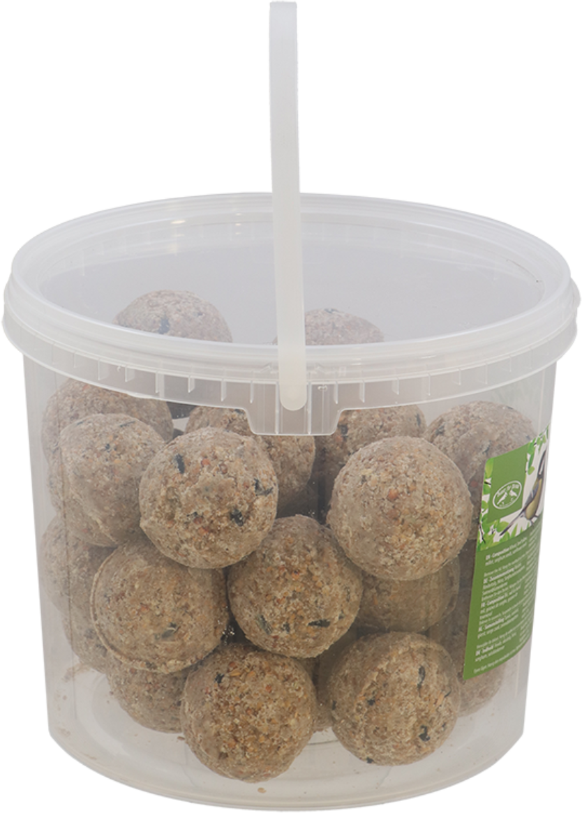 De vetbollen zijn omhuld met talg en bevatten tarwe, gierst en zonnebloempitten, waardoor ze een voedzame traktatie zijn voor de gevederde dieren. Om de natuur en de dieren te beschermen, zijn de vetbollen niet verpakt in plastic netten en kunnen ze gewoon in houders worden geplaatst!