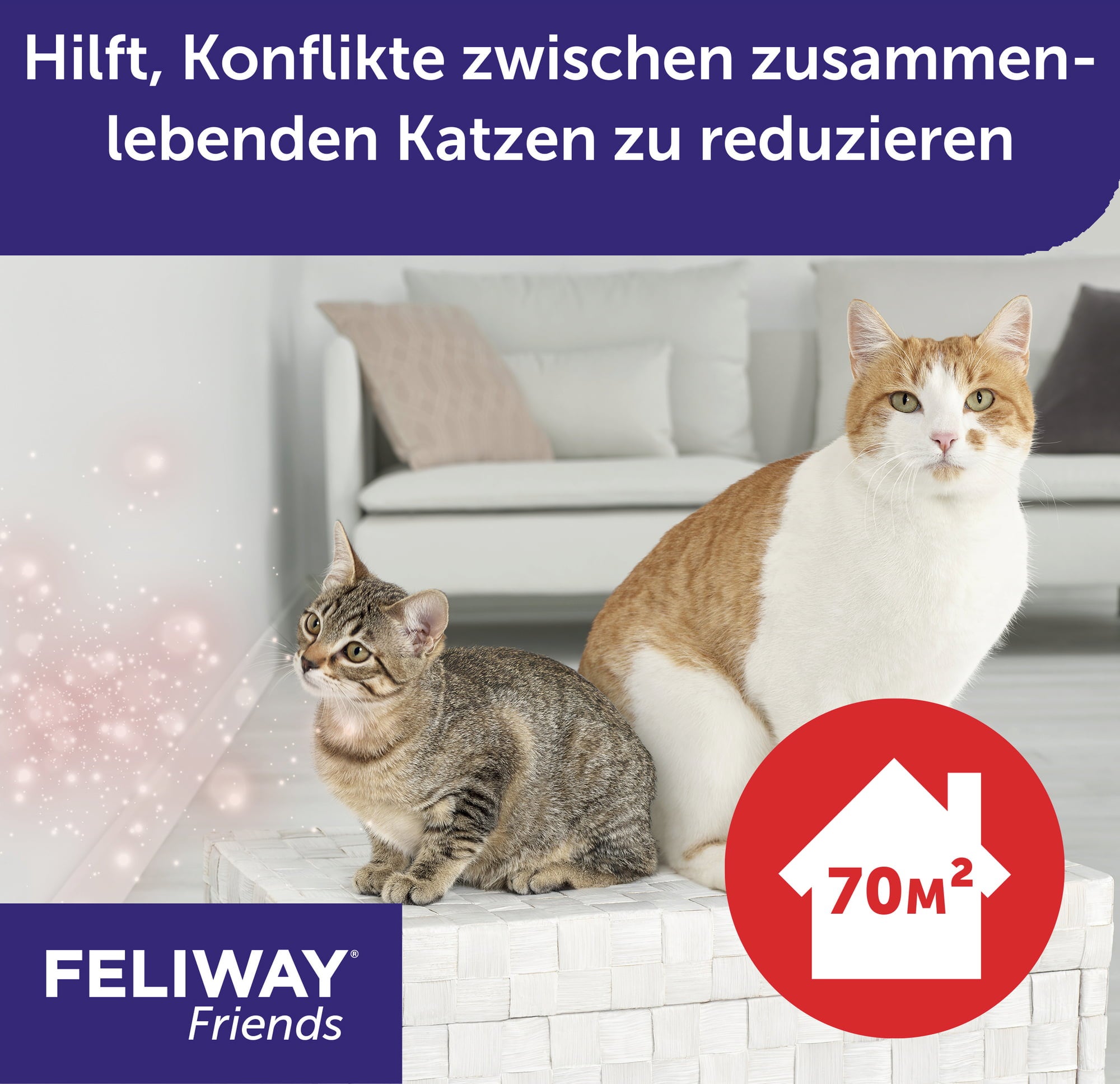 De Feliway Friends Startset bestaat uit een stopcontact-verdamper en een flacon met feromonen die kunnen helpen conflicten tussen samenlevende katten te verminderen.