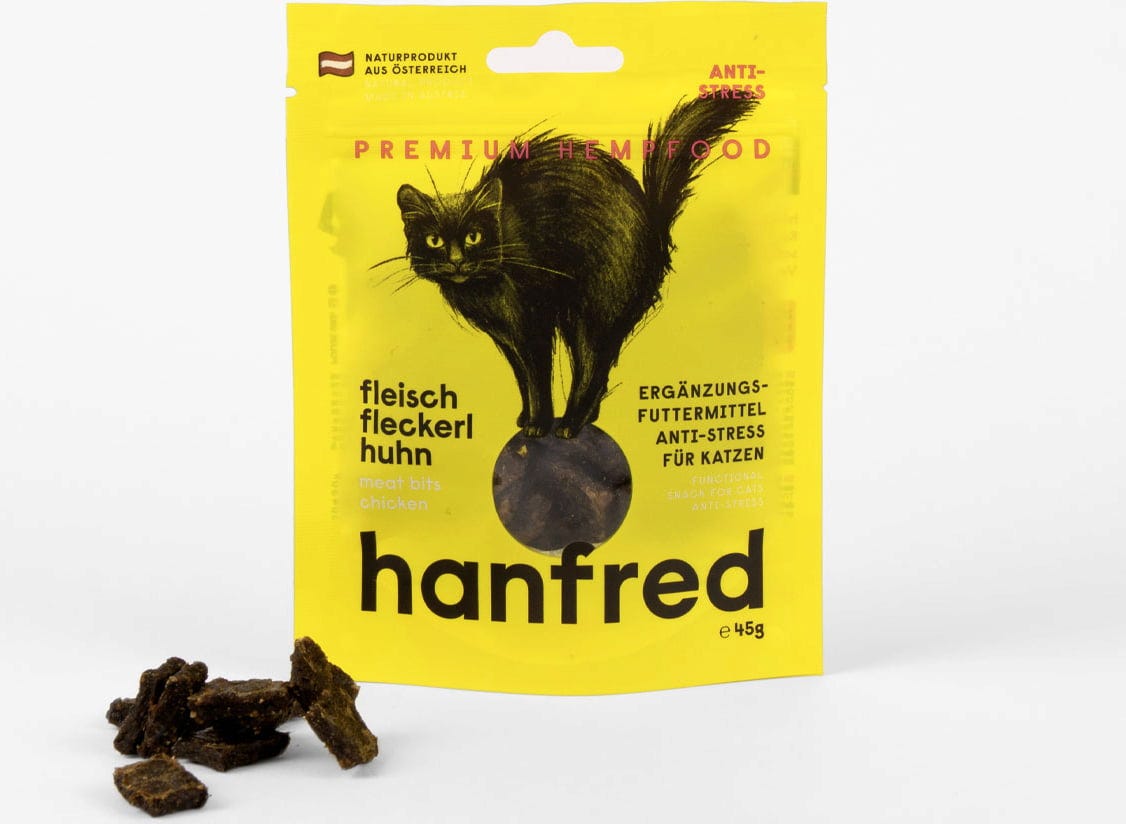 Als je kat gevoelig reageert op veranderingen of stressvolle situaties, kan deze snack een goede keuze zijn. Hanfred vleessnoepjes bestaan voor 95 % uit vlees en voor 5 % uit henneppoeder - zonder granen of kunstmatige toevoegingen.