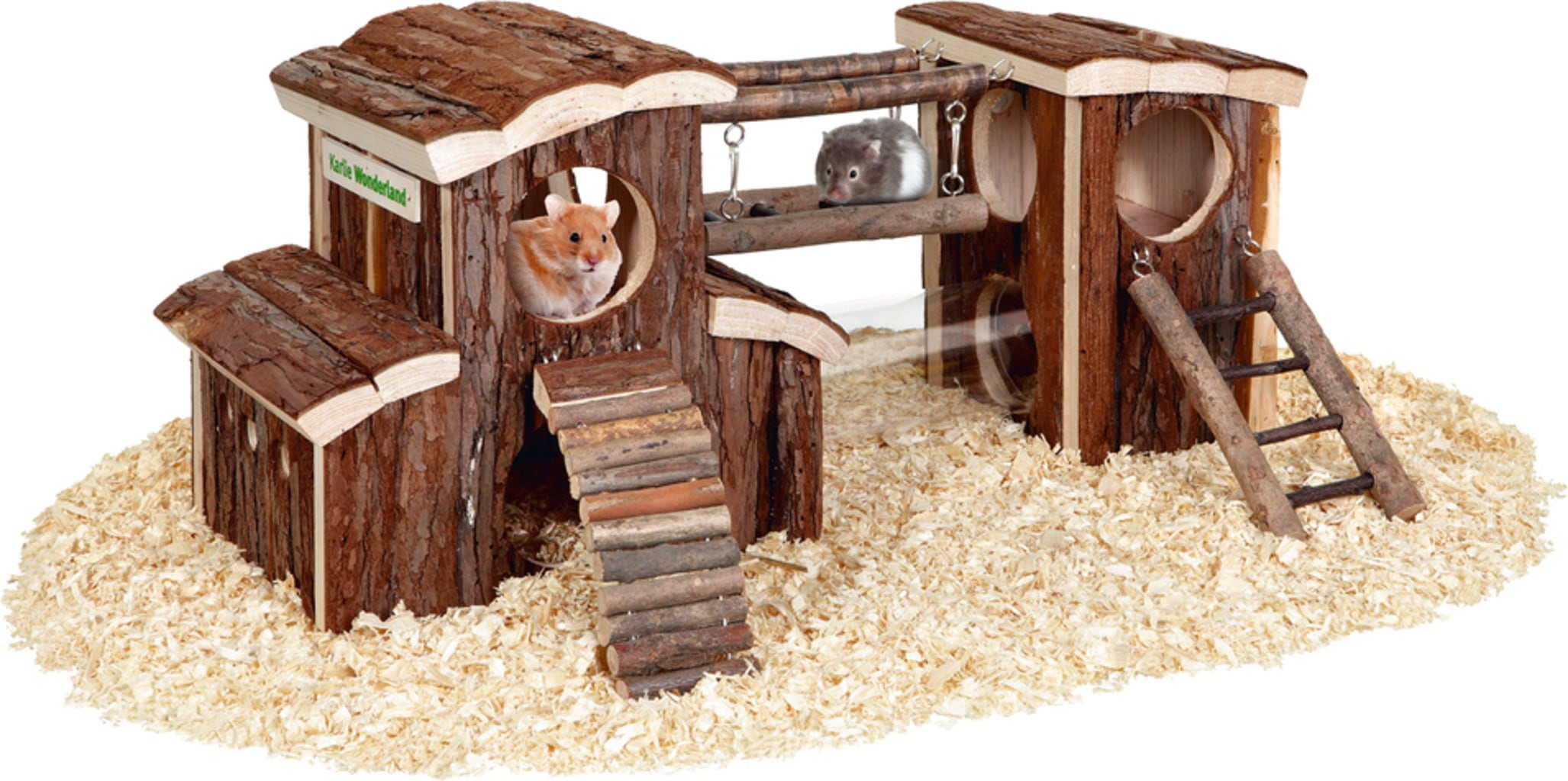 Deze speeltuin is een heel bijzondere verrassing voor kleine knaagdieren en een heerlijke afwisseling die elke dag nieuwe speelmogelijkheden biedt. Ze kunnen klimmen, zich verstoppen en schommelen, wat ze maar willen. En het natuurlijke hout met schors nodigt ze ook uit om te knagen en te knabbelen.