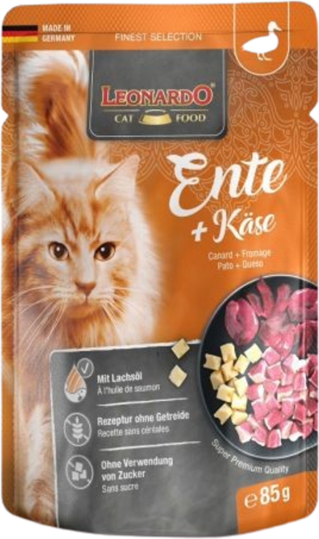 Sappig vlees en smakelijk orgaanvlees van eend en kip worden verfijnd met het bijzondere ingrediënt kaas en maken elke maaltijd tot een waar culinair hoogtepunt! Zorgvuldig geselecteerde grondstoffen worden in maaltijdzakken gekookt en verfijnd met waardevolle zalmolie. Laat kattenharten sneller kloppen!
