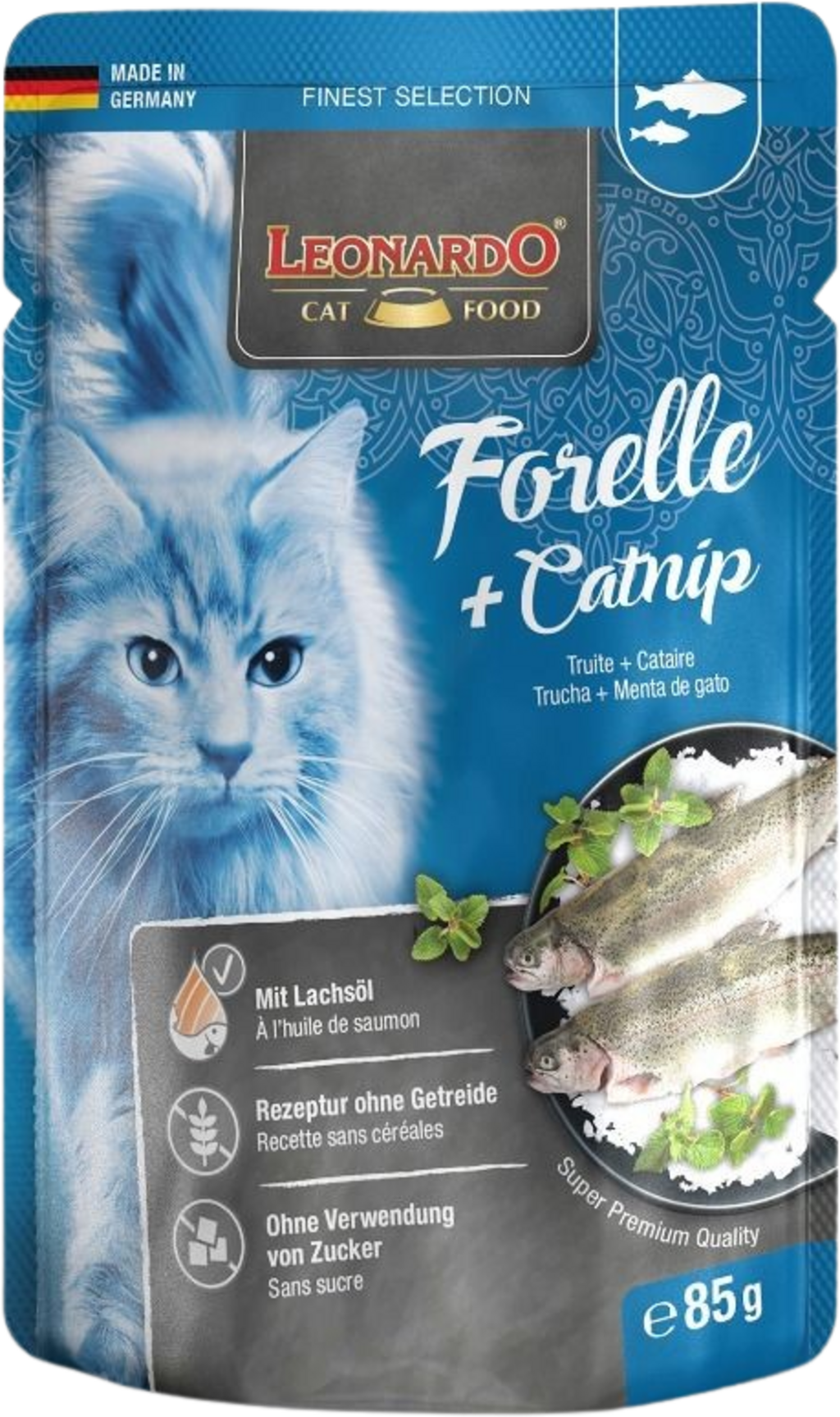 Sappig vlees en smaakvol orgaanvlees van forel, kip en rundvlees worden verfijnd met kattenkruid en maakt van elke maaltijd een echt culinair hoogtepunt! Zorgvuldig geselecteerde ingrediënten worden gekookt in maaltijdzakjes en verfijnd met waardevolle zalmolie. Laat kattenharten sneller kloppen!