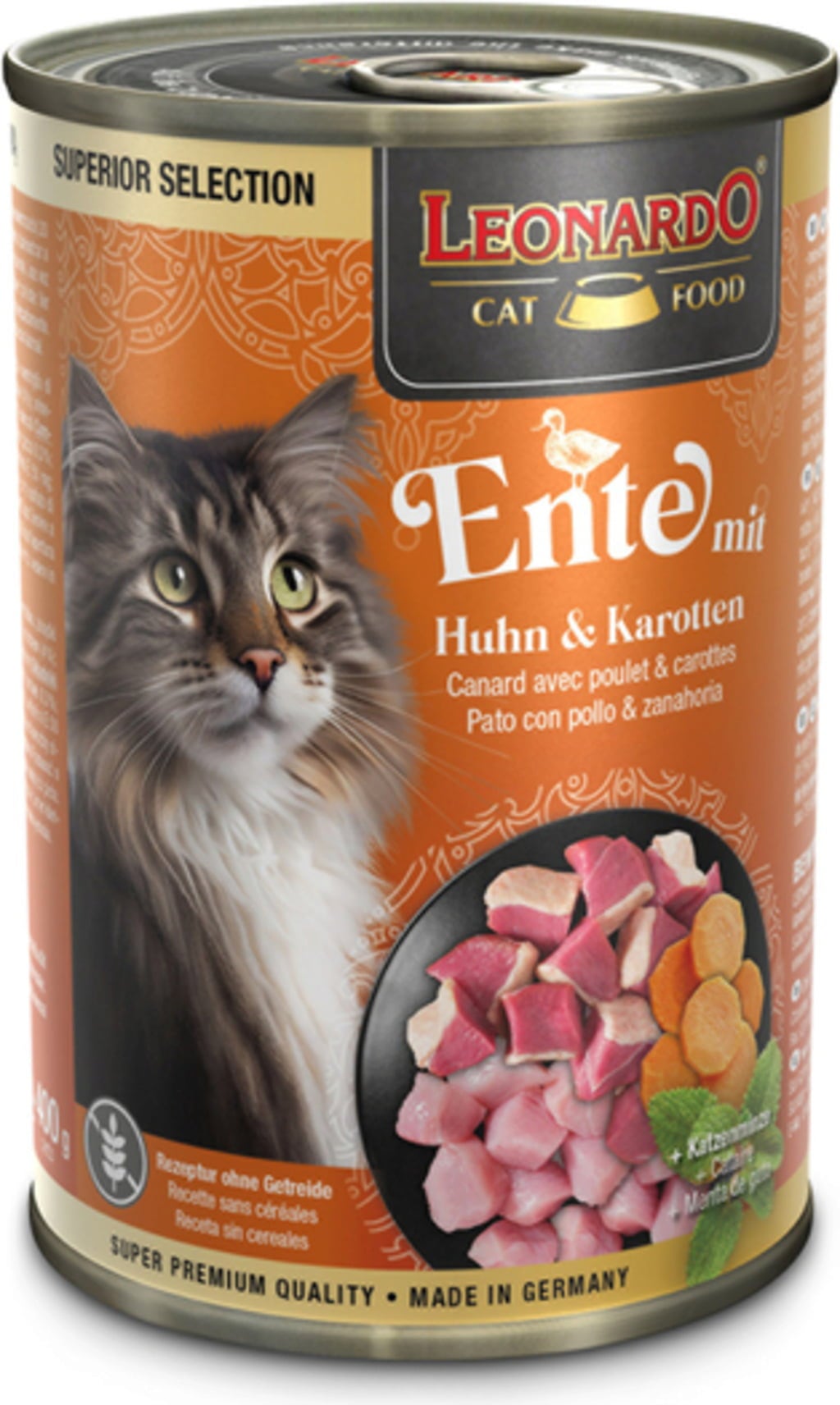Leonardo's Superior Selection is een heerlijk kattenvoer uit blik dat waardevolle voedingsstoffen uit smaakvol kippen- en eendenvlees combineert met slachtafval en heerlijke wortelen. Een mix om verliefd op te worden!