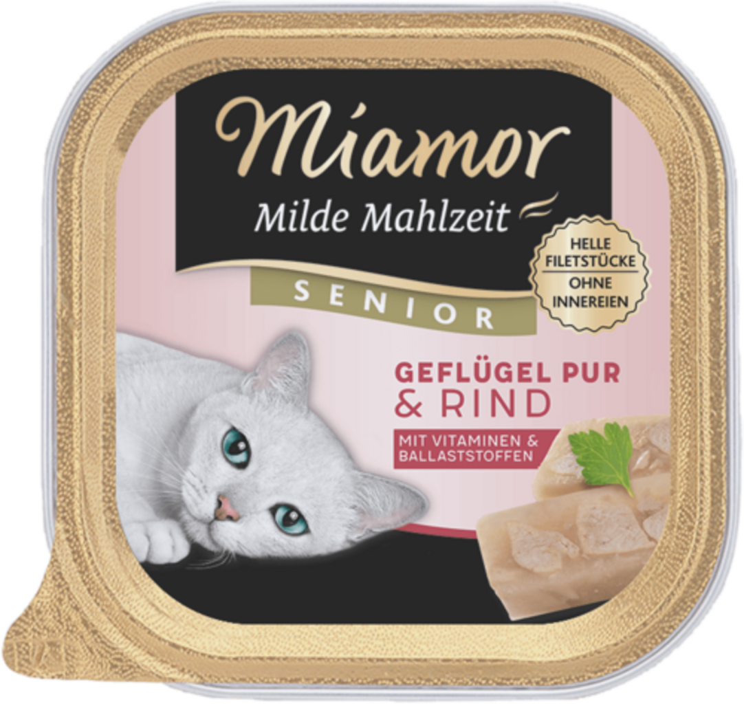Dankzij de toevoeging van gevogelte is Miamor's Milde Mahlzeit Senior een licht verteerbare maaltijd en daarom ideaal voor oudere katten die neigen naar overgewicht en sedentair zijn. Voorzichtig bereid en verrijkt met waardevolle vitaminen en vezels, ondersteunt het de gezondheid en vitaliteit van je kat.