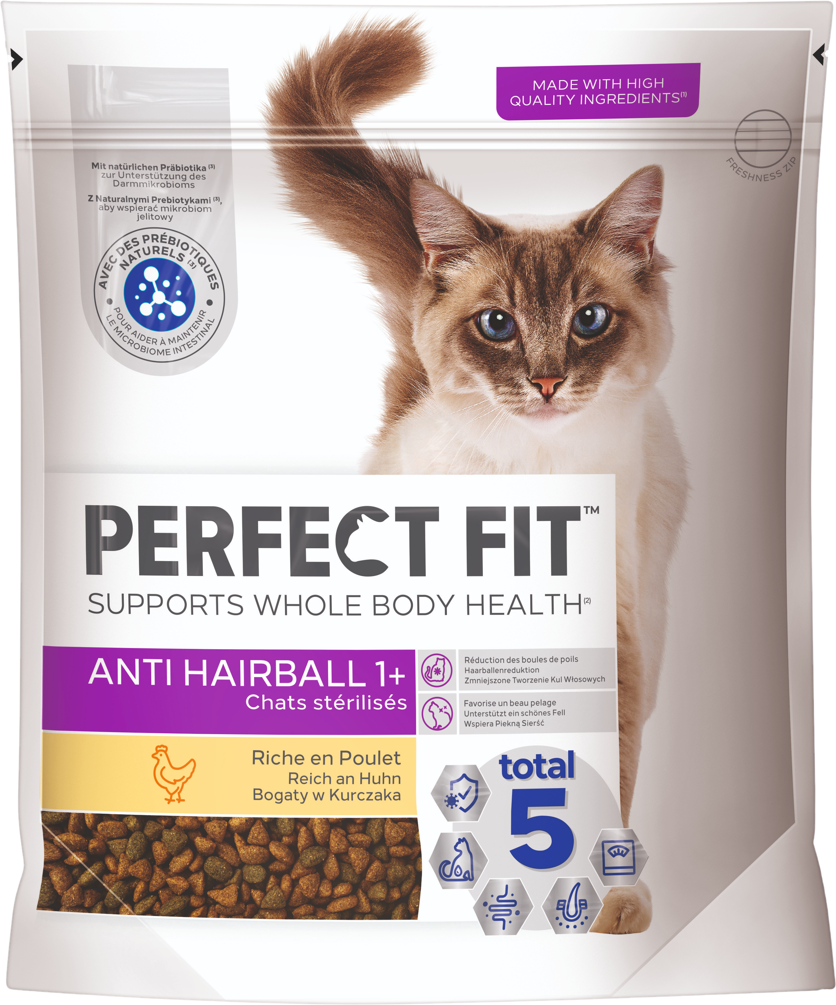 • Met de Perfect Fit Total 5 formule - ondersteunt een gezonde afweer, urinewegen, spijsvertering, huid en vacht, evenals een normaal gewicht en algemene lichamelijke conditie