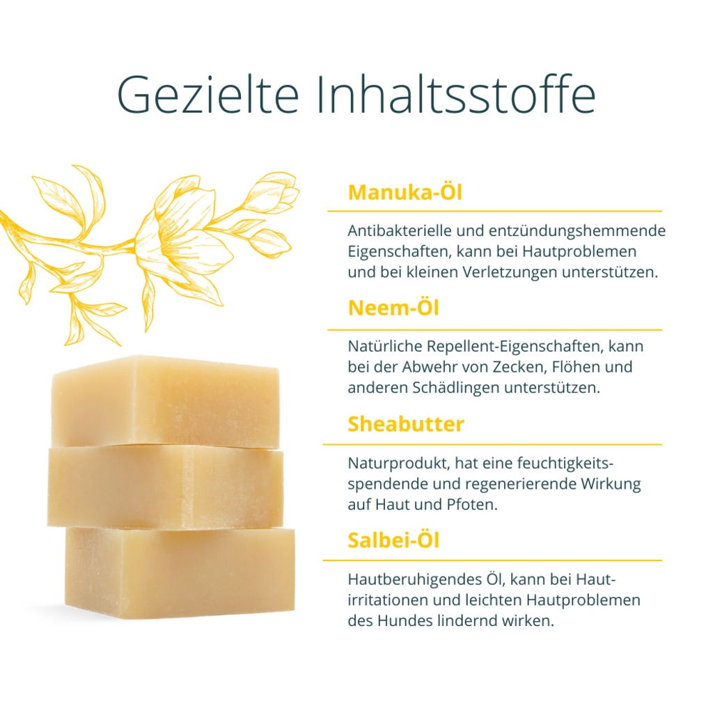 Dit is een veganistische natuurlijke zeep met manuka, neem en salie oliën die de vacht van je hond voedt, hydrateert en zachtjes reinigt. Bevat ook sheaboter, olijf- en kokosolie.