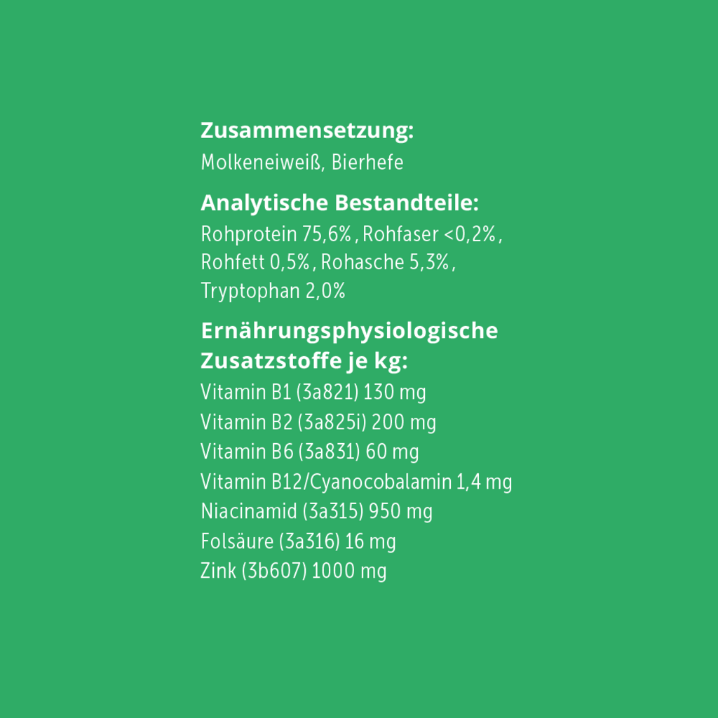 Het poeder is gebaseerd op een speciale formule die natuurlijke tryptofaan uit hoogwaardig wei-eiwit combineert om een evenwichtige gemoedstoestand bij huisdieren te bevorderen. Naast tryptofaan bevat de formule een uitgebalanceerde mix van B-vitamines en waardevolle mineralen. Geen kunstmatige kleurstoffen, conserveringsmiddelen of smaakstoffen.