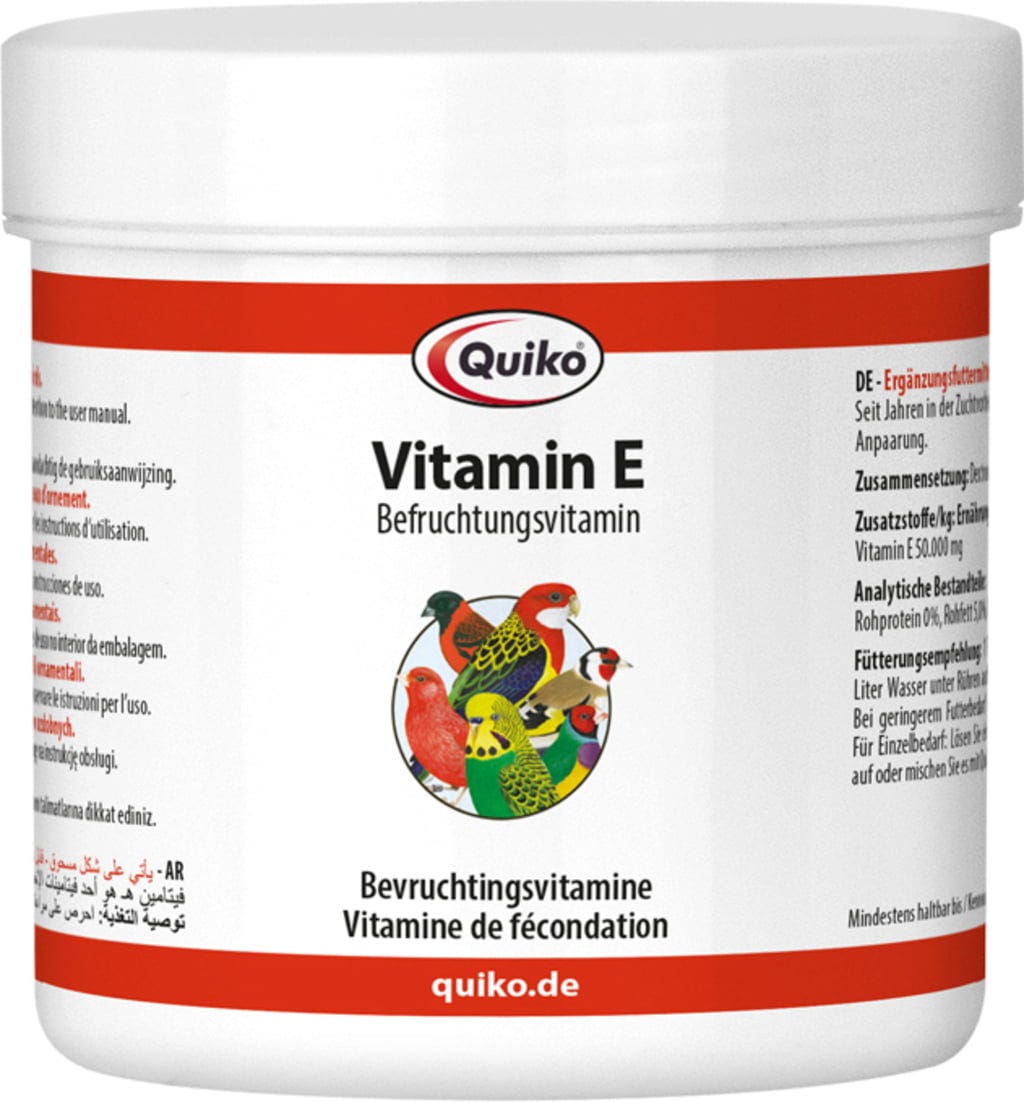 - Meng 3 maal per week 10 g Quiko Vitamine E in 1 kg Quiko eivoer of in 1 liter drinkwater. Indien nodig kun je de dosering verhogen.