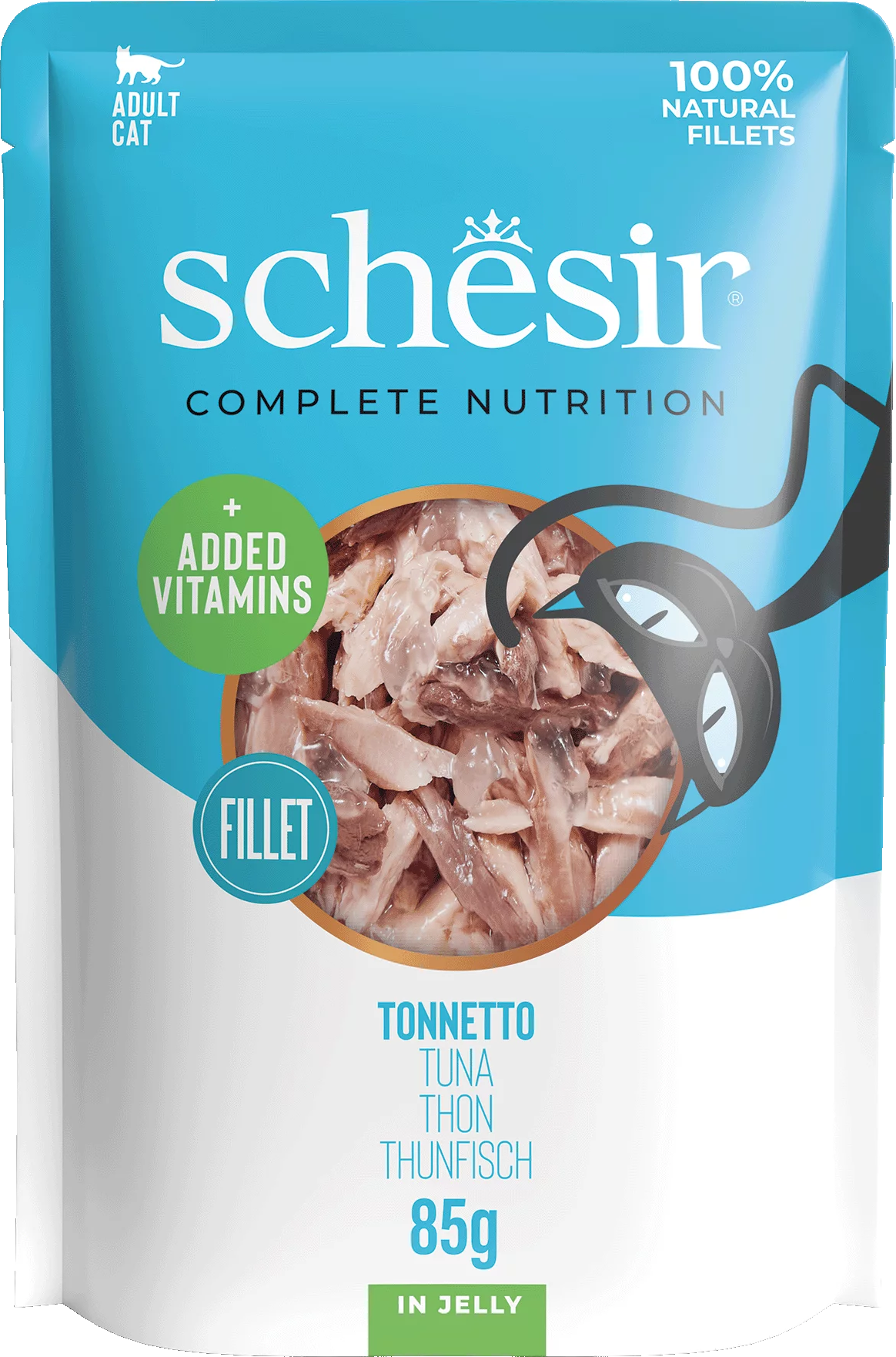 De maaltijdzakjes van Schesir zijn een hoogwaardig en gevarieerd natvoer met een geleiachtige consistentie en verleidelijke smaken. Het voer bevat 100% natuurlijke ingrediënten met de beste stukjes: