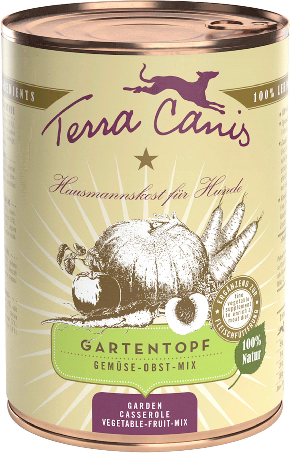 De Gartentopf groente- en fruitmix is de perfecte veganistische aanvulling op vleesvoer met zowel rauw en gekookt vlees als pure vleesblikken. De graan- en glutenvrije mix is bereid in een zacht kookproces en bestaat voor 80 % uit lekkere groenten en voor 20 % uit heerlijk fruit; alles bij elkaar 100% smaakvol!