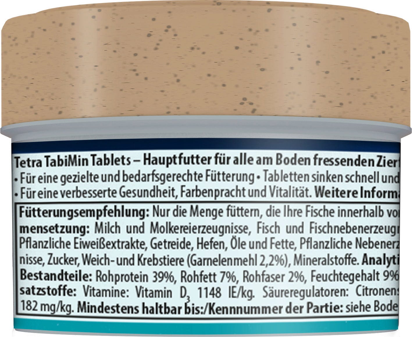 Tetra Tablets TabiMin is een biologisch uitgebalanceerd, voedingsrijk premium tabletvoer voor alle bodemetende vissen. De tabletten zinken snel, kunnen op verborgen plaatsen voor schuwe vissen worden geplaatst en lossen langzaam op voor gemakkelijke voedselopname zonder het water te desintegreren of te vertroebelen. De nieuwe multi-tablet formule bevat garnalen voor een betere acceptatie en alle essentiële voedingsstoffen, vitamines en mineralen. Zeewier met veel natuurlijke mineralen en carotionoïden dragen bij aan de natuurlijke versterking van de kleuren. Tetra-voer is licht verteerbaar, waardoor het water minder vervuild en schoon en helder blijft.