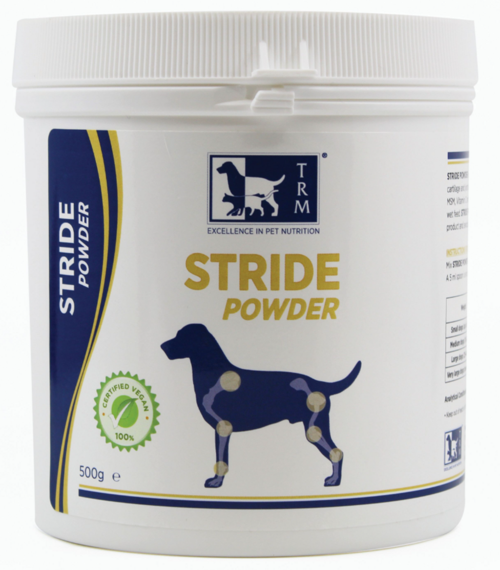 Stride Powder van TRM is een aanvullend diervoer in poedervorm dat de gewrichten en het kraakbeen van honden optimaal kan ondersteunen. Het is verrijkt met glucosamine HCL, chondroïtinesulfaat, MSM, vitamine C en mangaan en kan gemakkelijk worden gemengd met natvoer.