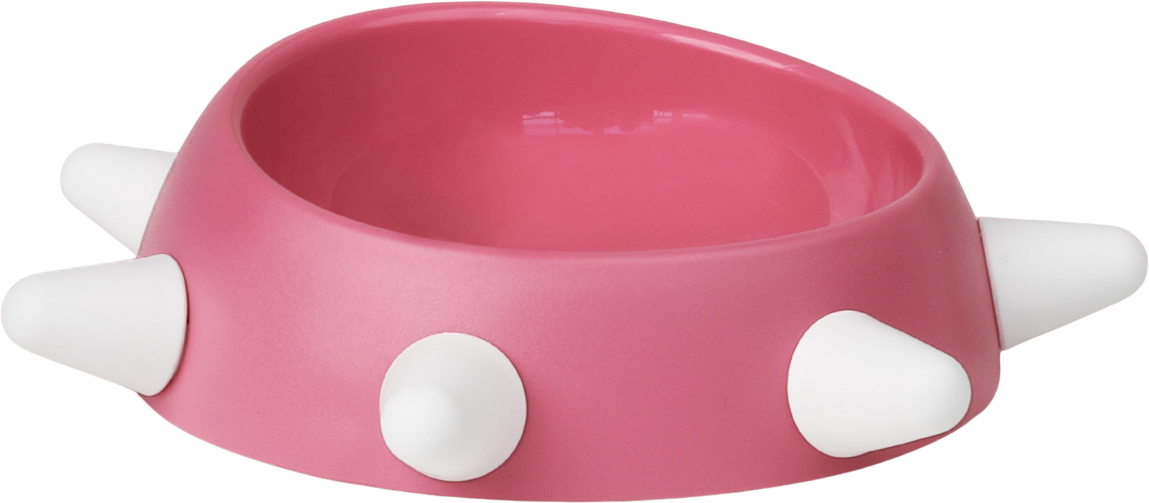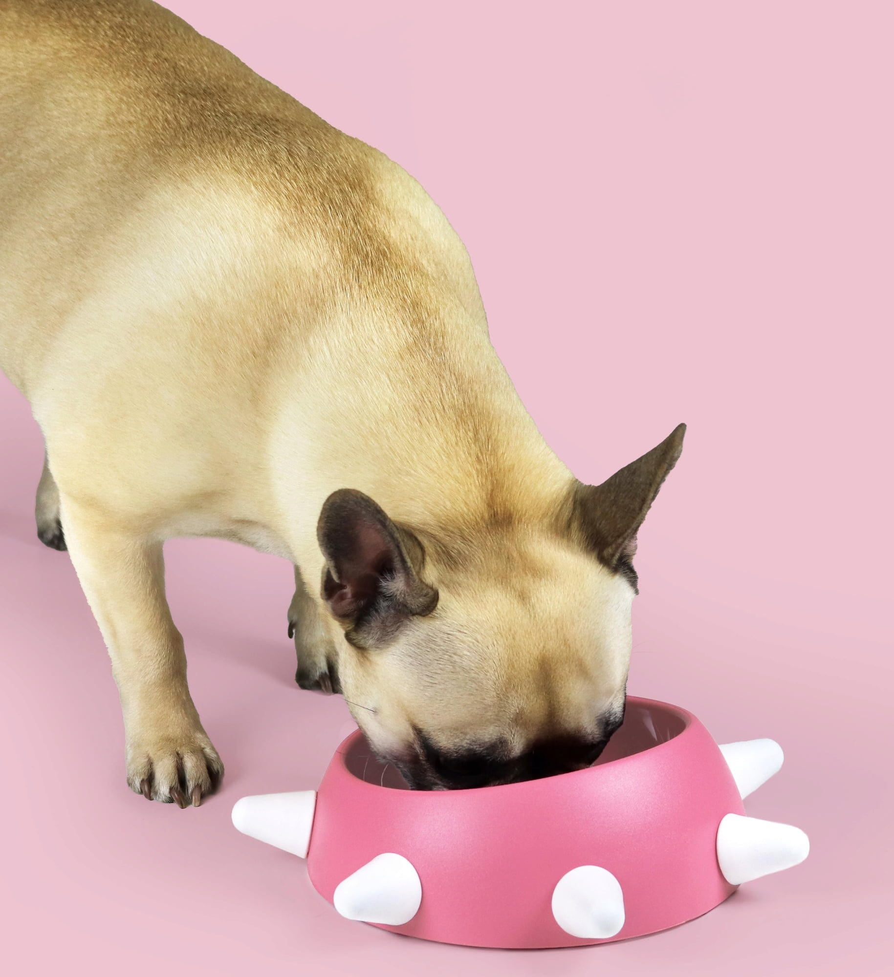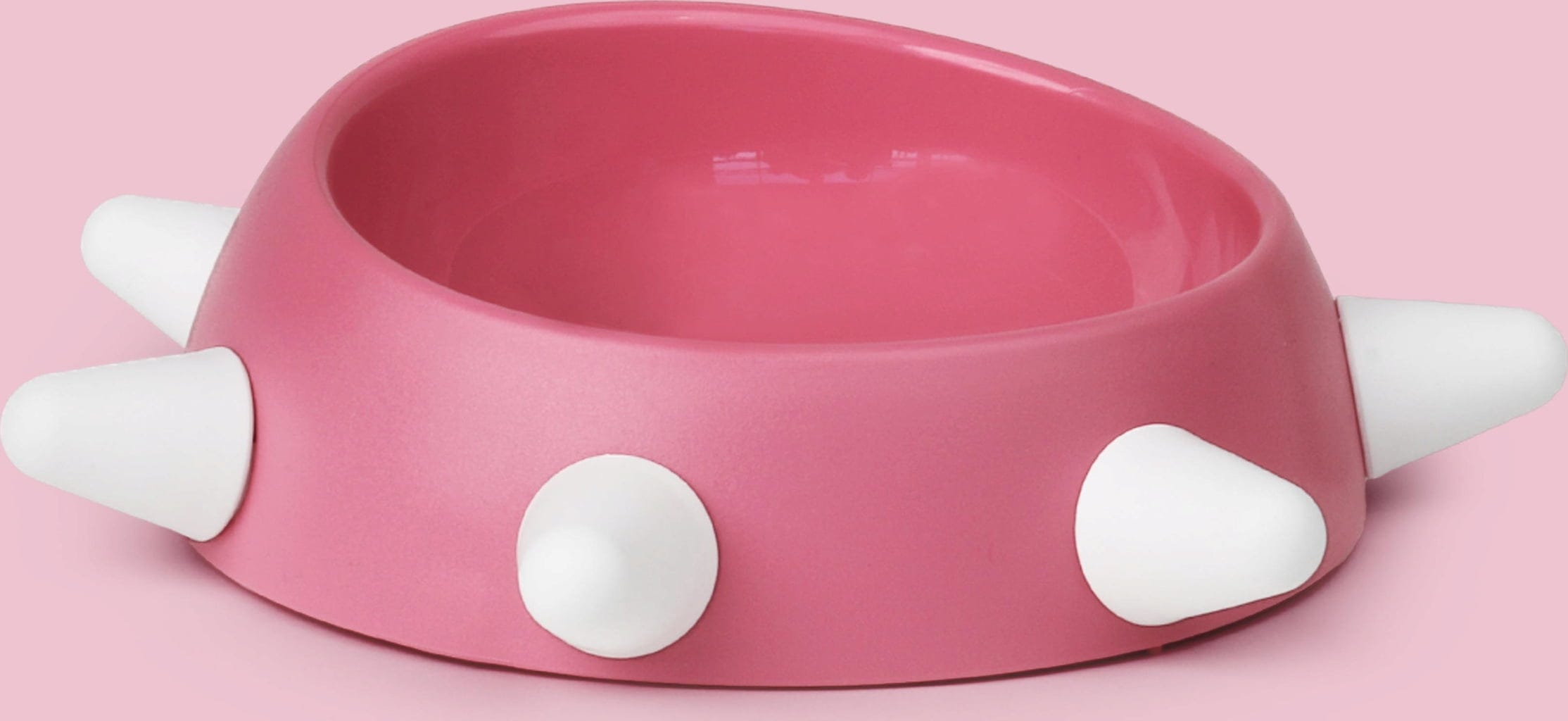 Deze kom ziet eruit als een grappige hondenhalsband. Maar het ontwerp is ook erg praktisch. De schuine vorm maakt het makkelijker voor honden met een brachycephalie om bij hun eten te komen. De plastic klinknagels zorgen er tevens voor dat de kom makkelijker vast te houden is.
