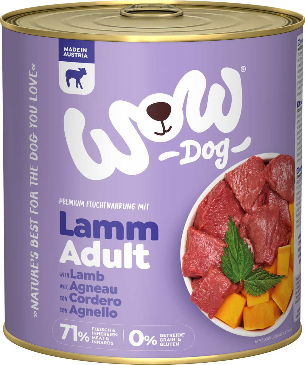 ADULT met lam, pompoen + brandnetel van WOW is een smakelijk compleet menu voor je volwassen viervoeter. Het kan worden gegeven aan alle rassen en hondenmaten. Het bevat geen toegevoegde suikers, smaakstoffen of conserveringsmiddelen. In plaats daarvan is het op smaak gebracht met verse groenten en hoogwaardige kruiden.