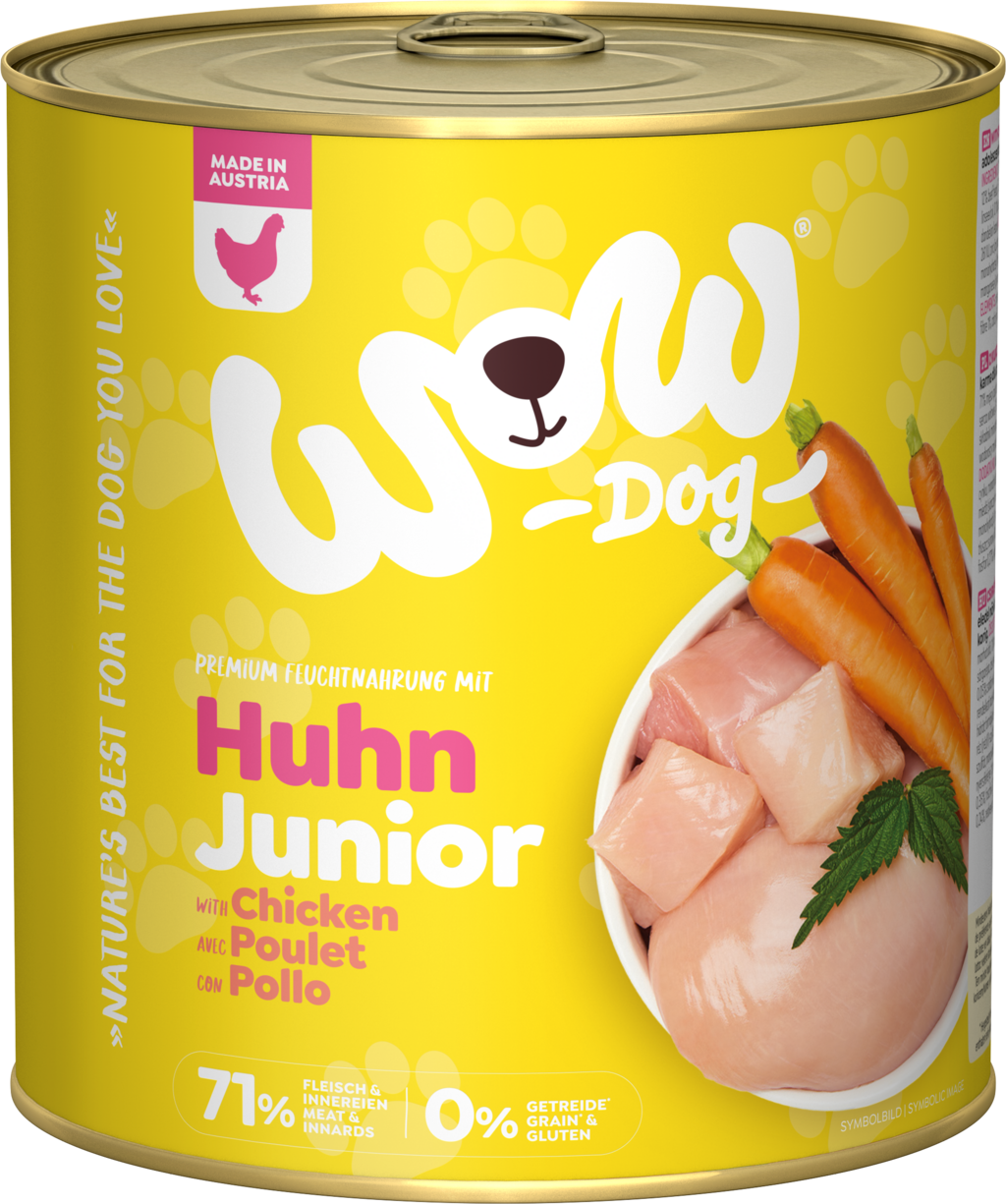 JUNIOR met kip, wortel + brandnetel volledige voer van WOW is gemaakt met 71% vlees en zonder granen, toegevoegde suiker of conserveringsmiddelen. Het kan speciaal worden gevoerd aan puppy's en jonge honden tussen 2 en 12 maanden.