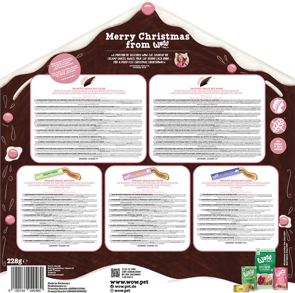 Verwen je kat elke adventsdag met de populaire krokante kussentjes van WOW. Je kat kan zich verheugen op 2 varianten, elk met 12 porties in 24 deurtjes. De krokante snacks bestaan uit een knapperig omhulsel en een smeuïge vulling van kip of zalm. Twee varianten die bijzonder populair zijn. Gemaakt zonder toegevoegde granen, suiker of zout en bovendien caloriearm.
